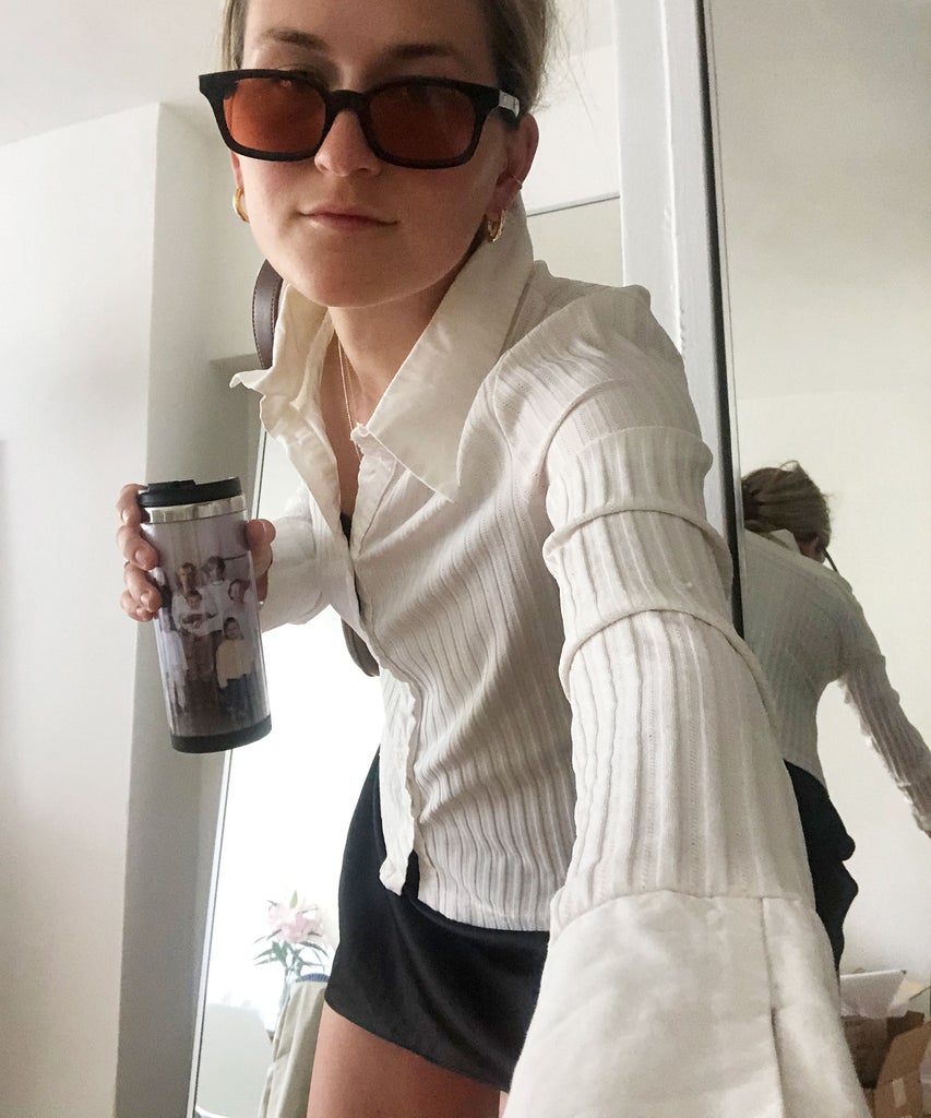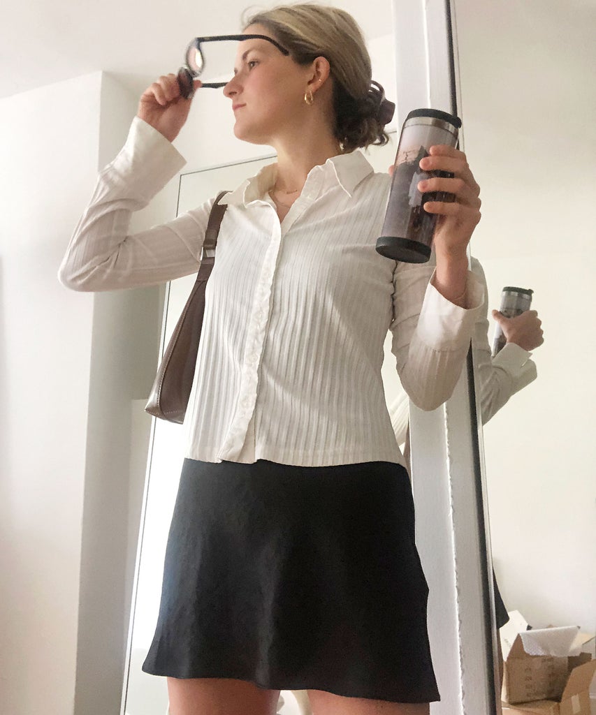 My attempts to recreate her signature Friday night dinner ensembles, however, were met with more resistance. Spaghetti strap dresses and shrugs don’t make frequent appearances in my day-to-day life, nor do silky blouses and slacks. Still, a recent slip dress purchase seemed like just as good an opportunity as any to try, so I dug out a ‘90s white button-up that I stole from my aunt and a to-go coffee mug (obviously). Unlike the time Lorelai had to get rid of a spider the size of a Buick, my venture into her dressier side was another surprising success.