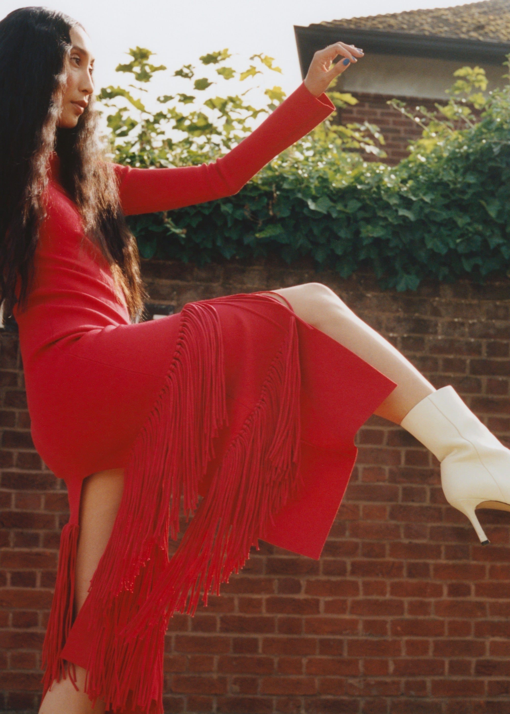 Standing for “All Wonderful Adventures Kindle Enthusiasm,” which embodies Alaverdian’s witty and creative takes on fashion, A.W.A.K.E. Mode’s influence is palpable throughout the collection. From a red midi dress with a flourishing fringed skirt (which Alaverdian designed specifically for this collection) to your classic button-down shirt with a built-in corset, each piece is packed with the avant-garde punch that the label is known for.