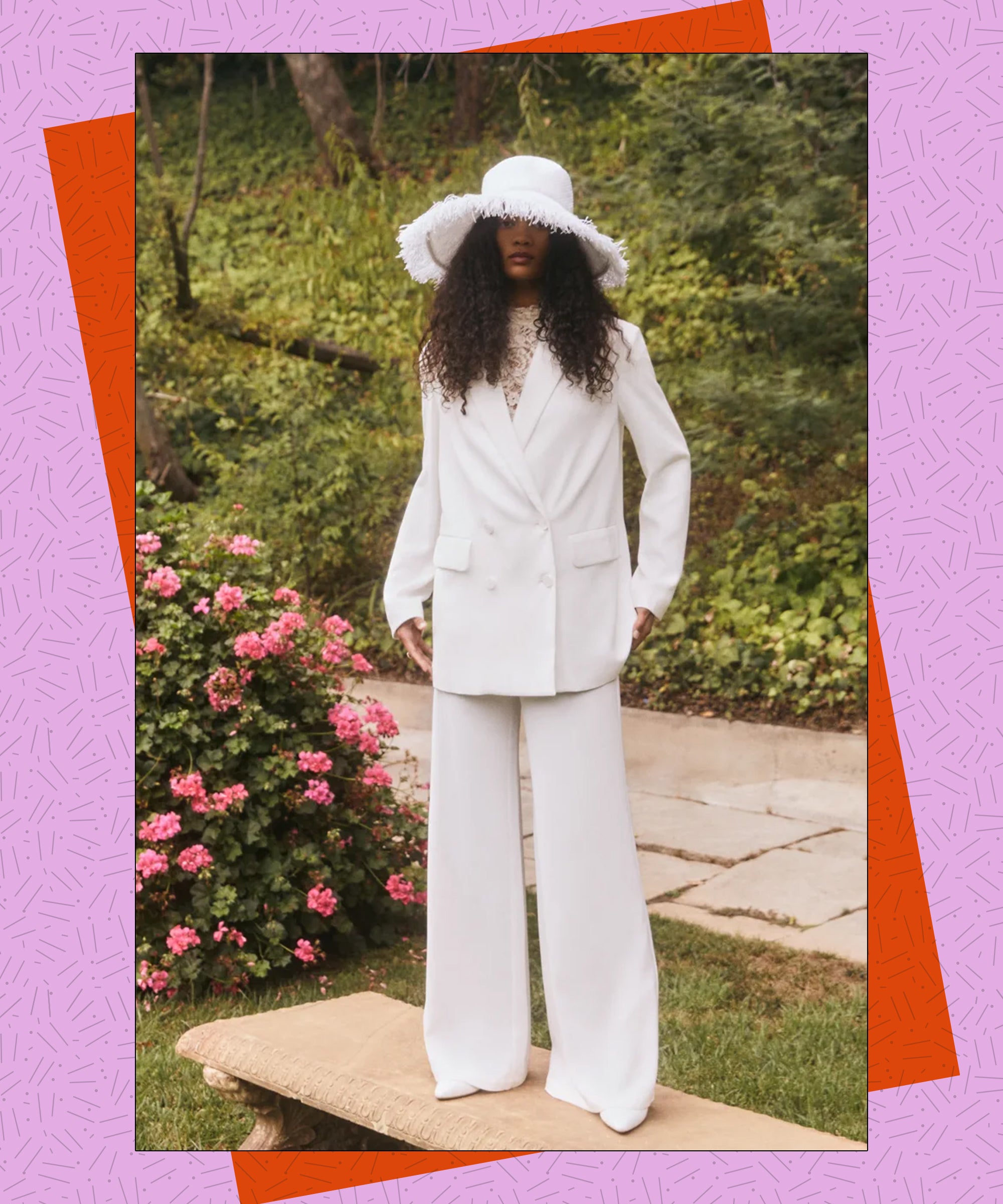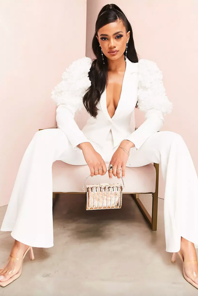 Furthermore, we don’t discriminate regarding all the splendors of pearly white suits. They come in all shapes, cuts, and styles. Yes, you have your classic white pantsuit that’s coastal grandma-approved. But you can also find ones with upgraded modern fits and silhouettes in breezy, clean-cut styles, glittery skirt suits, and even luxe sets with funky floral appliques. The list goes on and on, and we got you covered. (Just note most sets come individually, so you can mix and match or buy only the jacket or flared pants you were searching for.) Explore the wonders of all the different white suits, ahead.