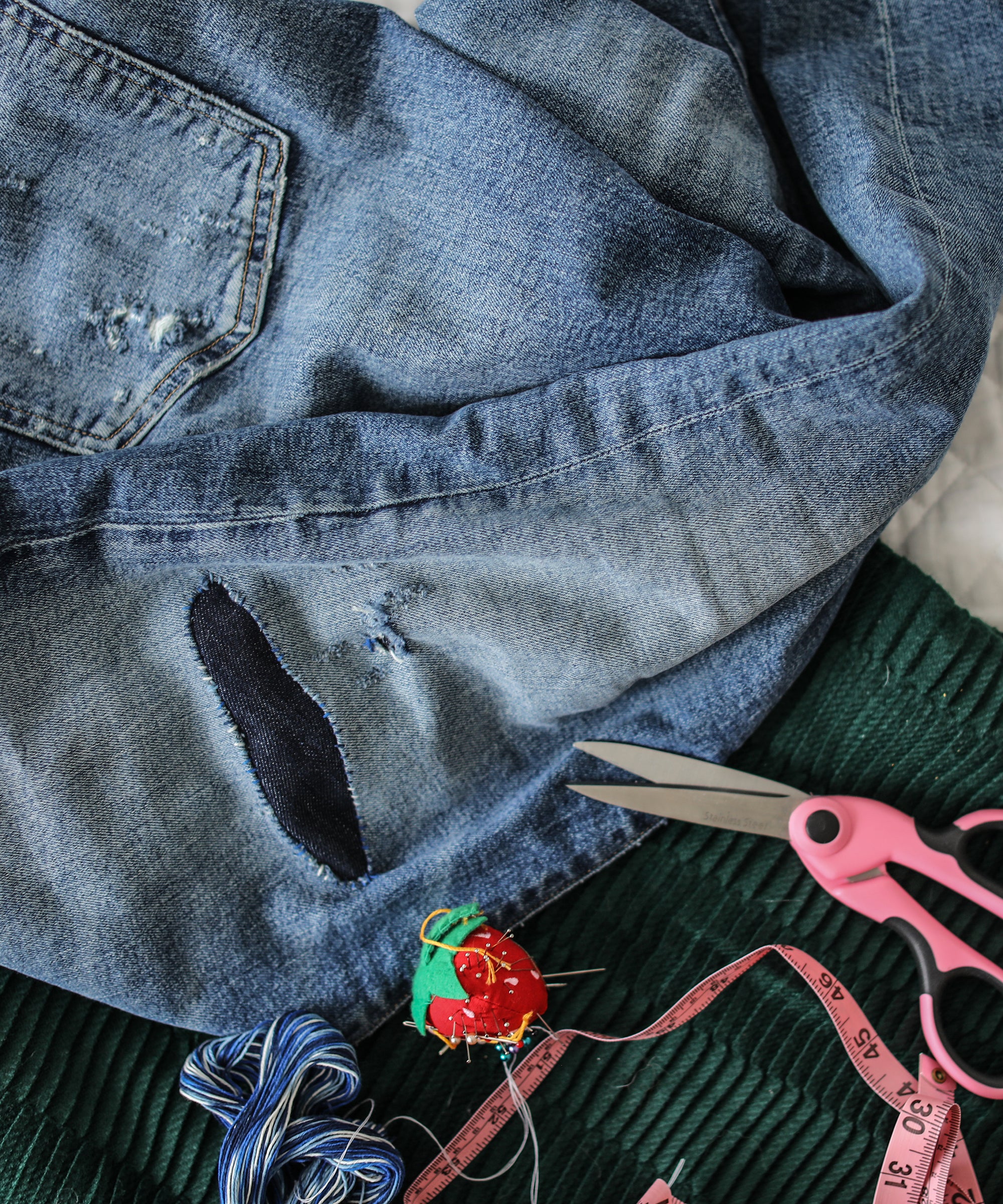 Shayman’s aim of divorcing herself entirely from big fashion brands is reflective of a larger shift in consumer mindset. According to a 2020 survey by Genomatica, 52% of American shoppers “believe that sustainability is important,” but 48% “don’t know how or where to find sustainable clothes.” It’s a conundrum made worse by greenwashing, where brands falsely advertise their products as environmentally friendly. Moreover, truly sustainable brands are often prohibitively expensive. Mending, on the other hand, is a hobby that almost anyone can adopt. “With mending, you’re averting waste. You’re not creating waste,” Smith says.