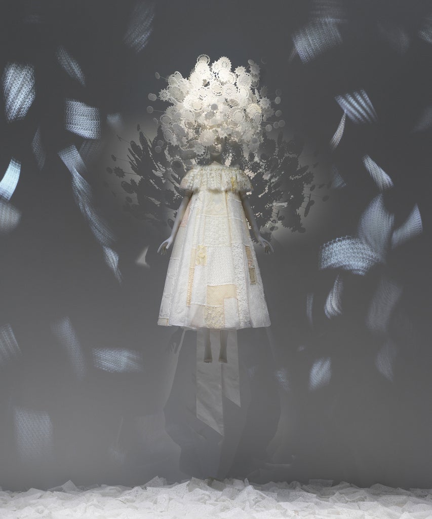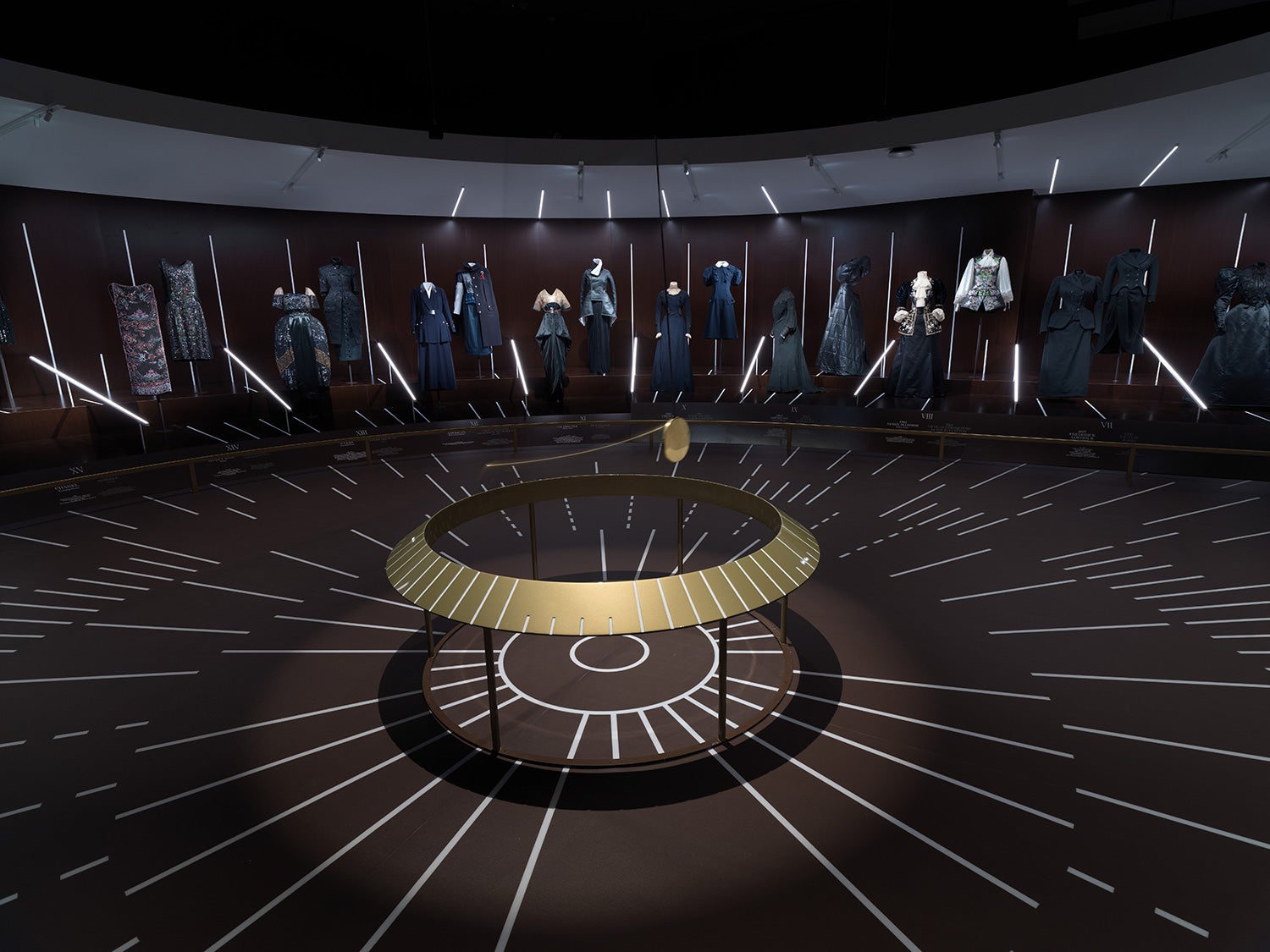 The exhibit tackles another topic that has become very timely as a result of COVID-19. With factories and warehouses forced to close down during lockdown in the spring, the pandemic has forced fashion to take a hard pause, as it was unable to complete collections. This prompted many brands to re-evaluate the constant churning of collections, that not only has a detrimental effect on the environment but also on the designers’ creativity, and look into other solutions, like upcycling. This seems to be the conclusion that “About Time” wants you to arrive at, with the exhibition ending with one of the few non-black looks in the exhibit: a white patchwork gown from Victor&Rolf’s spring/summer 2020 haute couture collection. Made from leftover fabric swatches, the strapless gown — shown suspended above ground in its own mini-room — is, according to the museum notes, a metaphor for the future of fashion, one that includes collaboration and sustainability.