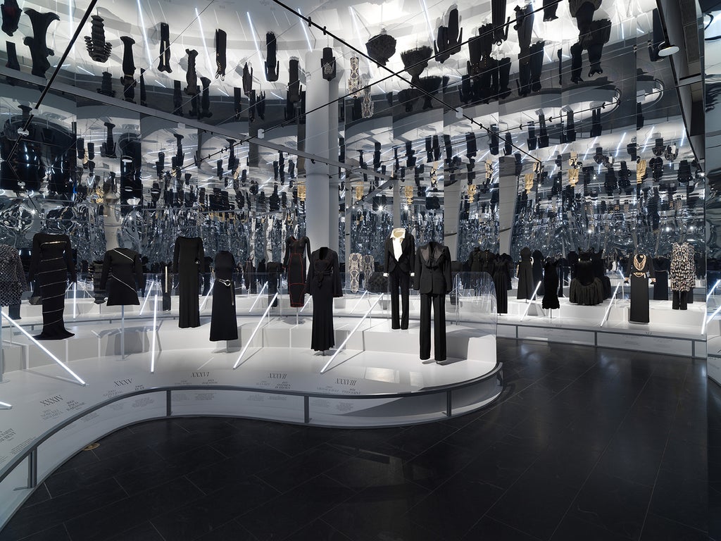 The second room — a winding, mirrored space that sends all senses into overdrive after the darker section — features an additional 60 ensembles that are matched up using less-clear parallels ranging from silhouettes and motifs to materials and techniques. As such, it sees the sculptural 2012 Iris van Herpen masterpiece that Solange wore to the 2018 Met Gala alongside an ivory 1951 Charles James silk satin ballgown (pictured below); a 1983 Karl Lagerfeld Chanel silk crepe dress, layered with trompe l’oeil necklaces and bracelets and belts of pearls, next to Sarah Burton’s 2019 Alexander McQueen crystal-embroidered tunic; and the 1994 Gianni Versace safety-pin embellished dress, famously worn by Elizabeth Hurley, with a 1977 Sandra Rhodes mini with safety pin detailing. While the museum notes refer to these less linear pairings as “disruptions,” today, they feel less like anomalies and more representative of the modern fashion industry — one that, at some point, abandoned looking at the outdated ideals of the past and has begun to find inspiration in the world and the people around them.