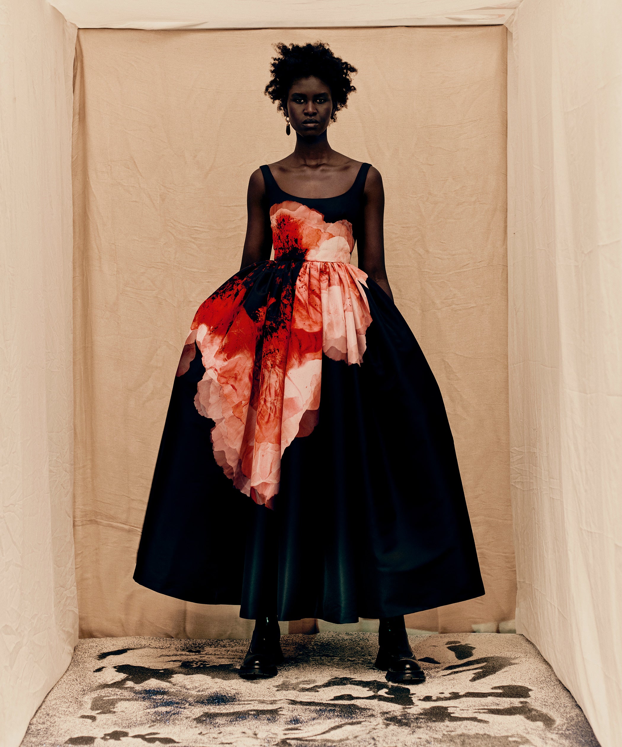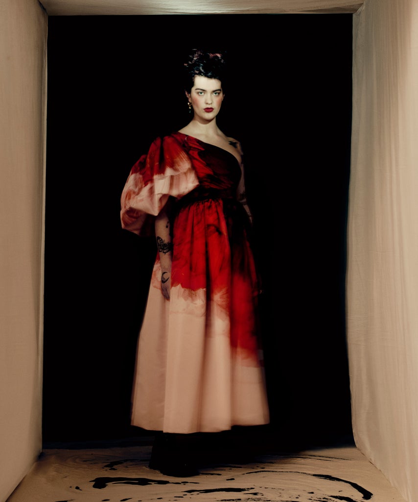Burton incorporated anemone prints into most of the collection’s pieces with blown-up and abstract florals appearing on pink-, black-, and red-hued garments. “Anemones are the most ephemeral flowers, here made permanent in cloth,” wrote Burton. Anemones are also one of the species most impacted by climate change as extreme heat waves continue to bleach their vibrant colors. Water was another big theme of the line, resulting in layered white-and-silver off-shoulder and T-shirt dresses that resembled sea foam.