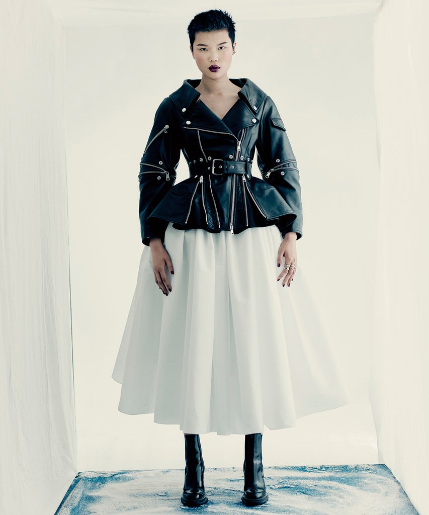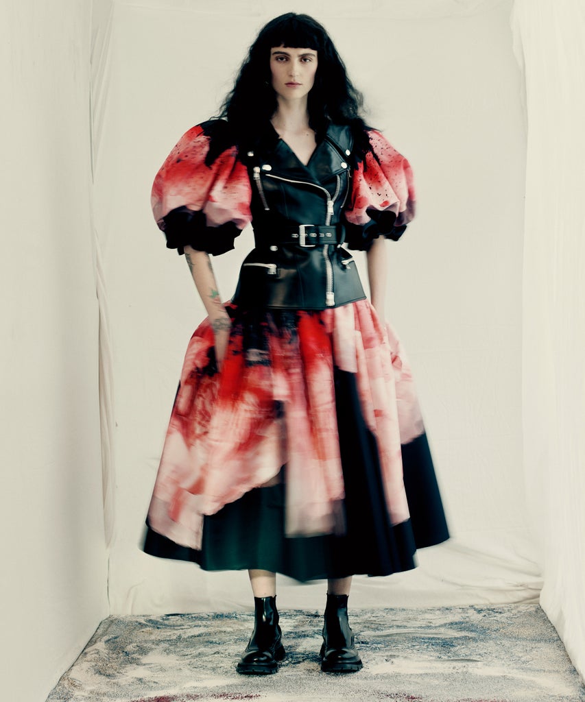 While this collection is intended to heal, it also revealed some darker themes with punk-inspired leather and denim pieces like moto jackets, belts, and dresses, all juxtaposed with the romantic shapes that have characterized Burton’s work at Alexander McQueen.