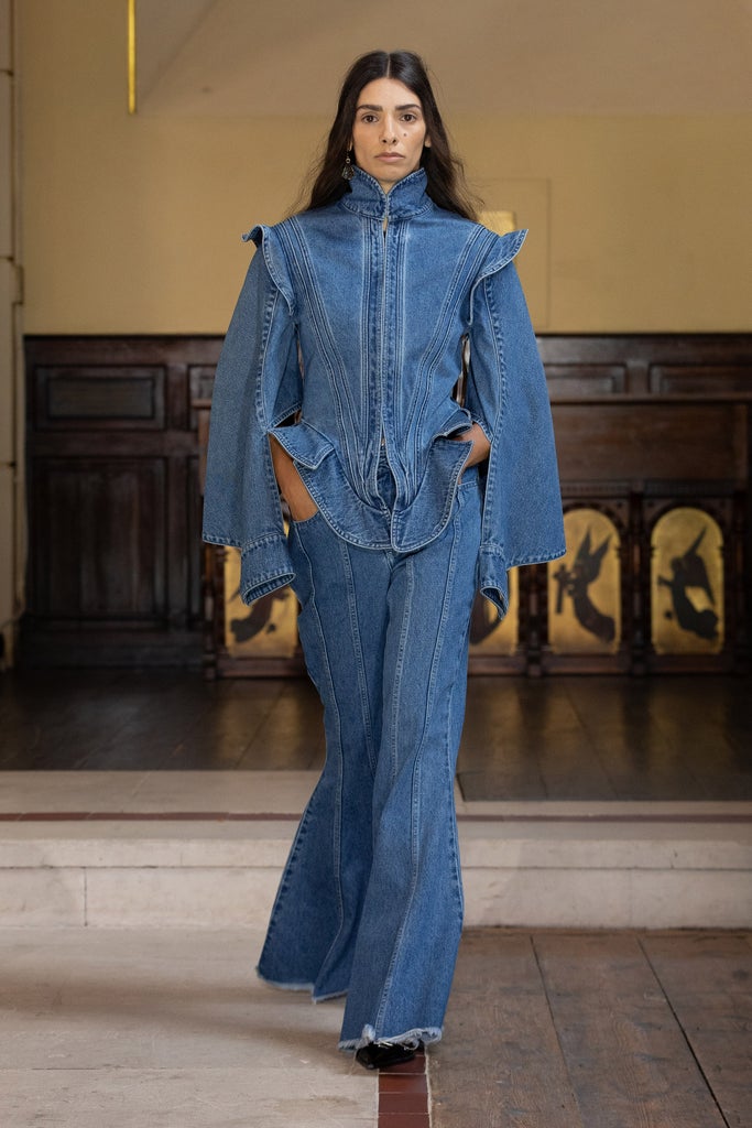 A statement collar has the power to shape an entire outfit and this season, they get main character treatment. Simone Rocha’s signature beaded and pearl embellishments graced collars and lapels via structured denim jackets, high-neck knit cardigans and oversized shirt dresses. Meanwhile, Chopova Lowena embellished Peter Pan collar blouses with metallic butterflies and floral motifs.