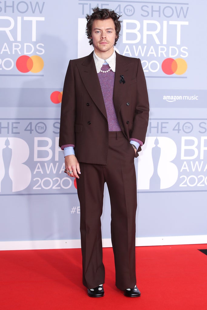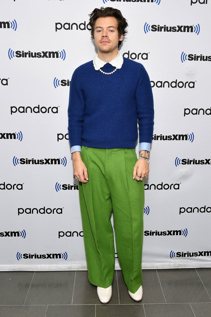 The same month as the TODAY show performance, the Fine Line singer wore a brown double-breasted Gucci suit for the 2020 BRIT Awards. Over a delightful poplin-collared white shirt, Styles wore a lilac sweater. While it was all very good, what made the outfit stand out the most was the pair of Mary-Jane-esque shoes reminiscent of what I used to wear to elementary school. A month later, for a SiriusXM Studios visit, Styles recreated the style formula by pairing a navy blue sweater with a shirt with a scalloped collar and bright green pants, again courtesy of Gucci. Whichever look you’re thinking of copying, don’t forget Styles’ signature pearls.