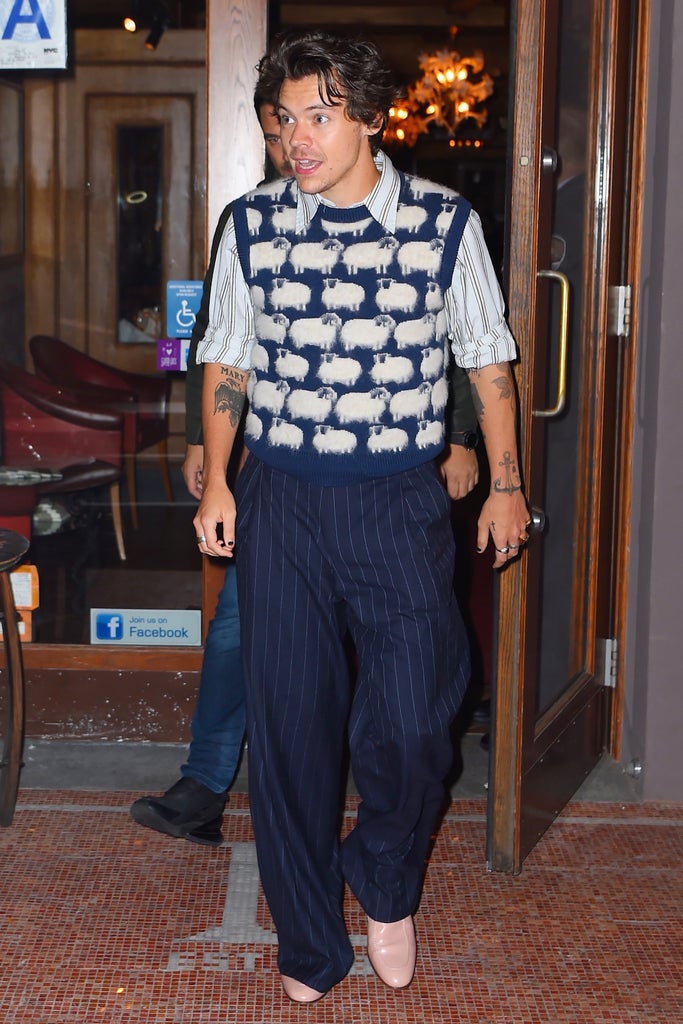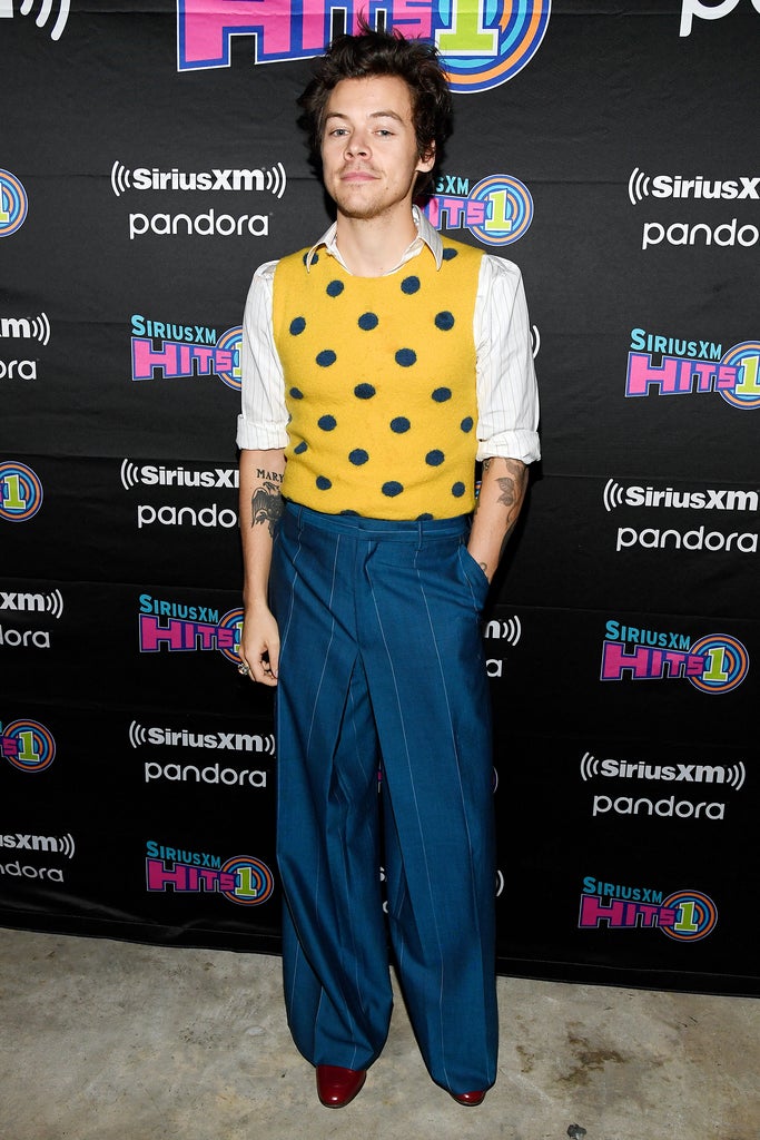 In November of last year, Styles stepped out in what might be his best sweater look — a sheep-emblazoned Lanvin vest that many compared to the sweater Princess Diana wore to a polo match in the ‘80s. Adding to the retro vibe were his ‘70s-esque flared slacks and a striped collared shirt. Fast-forward to a few months later, and Styles recreated the look while performing with Lizzo during Super Bowl Week, wearing a fitted, cropped striped vest over an oversized, untucked shirt and a pair of similarly wide-legged trousers in brown. In February, for a SiriusXM x Pandora performance, Styles opted for yet another can’t miss vest — this time, in yellow and featuring blue polka dots — over a collared shirt, which he styled once again with navy striped pants.