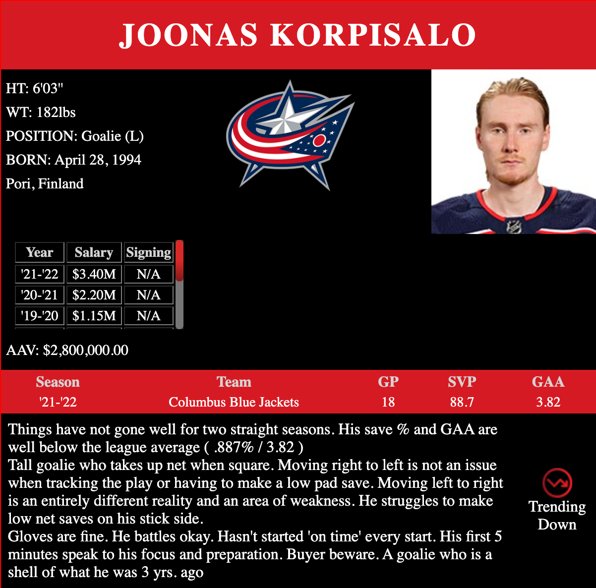 Is Korpisalo even a backup you’d prefer to spend an asset on? That’s the question anyone is asking themselves and, perhaps, he’d be added to be a third-string “safety net” somewhere instead. There is not a lot of upside here and it’s not even obvious that Korpisalo would be an upgrade in a lot of situations.