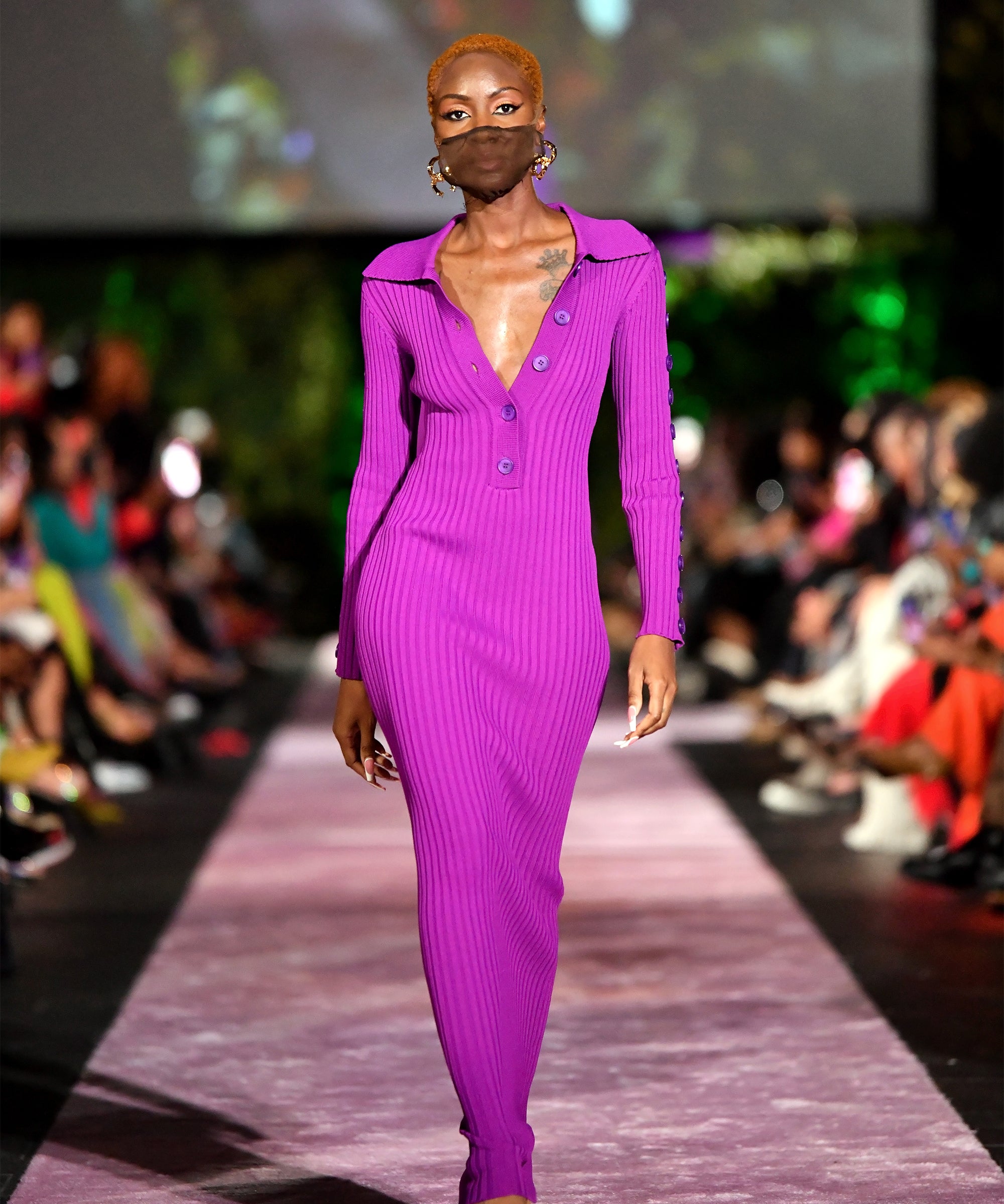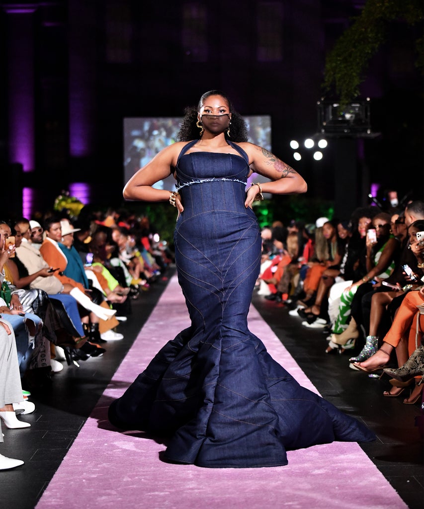 R29Unbothered was in D.C. for the Hanifa show and looking out into the audience, the support for the brand was overwhelming; several Black women showed up wearing their favorite pieces from her previous collections, the Pink Congo Label and Hanifa Capsules, a testament to the community that continues to rally behind the fashion designer. The 35-piece collection showcased at the event solidified exactly why we’re all rooting for her. In addition to the models being diverse and ranging in various body types and sizes, the Fall/Winter 2021 ready-to-wear collection represented Hanifa’s signature styles, such as bold colors, abstract patterns, and ribbed knitwear. With this collection, she took her signature looks a step further by including modernized suiting, structured denim, fringed tops, and footwear. Mvuemba also made sure to incorporate the beloved silhouette that longtime fans of her collections are used to knit midi dresses in an eye-catching color palette.