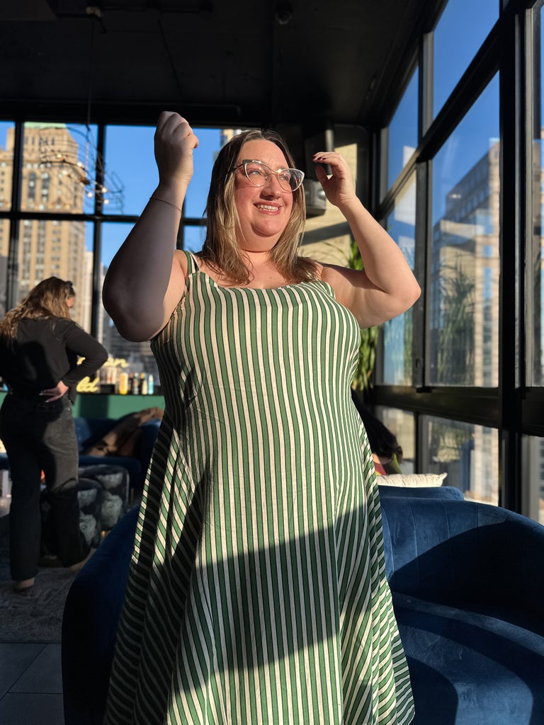 I also appreciate that the straps are both adjustable and wide enough to be regular bra-friendly (a bonus if you also try to avoid wearing strapless bras as much as possible!) The green-blue-white stripes make for such a fun print, too. Altogether, this is the type of piece that I’d reach for regularly come summer (and it looks great layered under a blazer now!) This dress is a 2x, and it fits perfectly. The linen rayon blend also seems to be more wrinkle-resistant than 100% linen, as I still looked fresh at the end of a full day of wear.