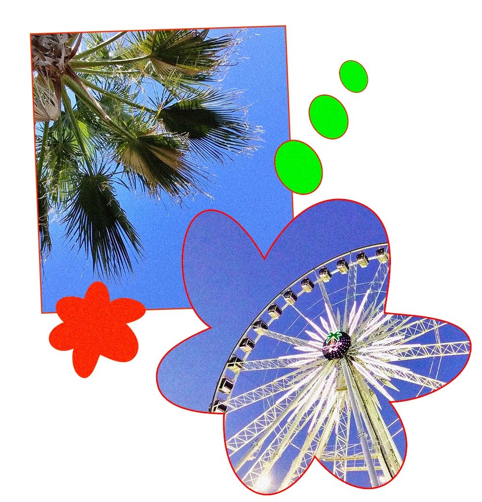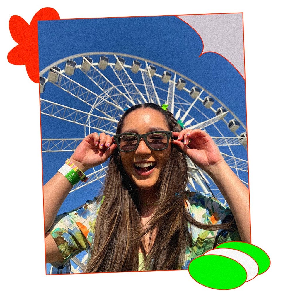 1:17 p.m. — We finally enter the desert oasis that is Coachella! The first thing we see is the iconic Coachella ferris wheel towering over us. It doesn’t feel real to be witnessing it in person. Seeing landmarks like this in real life is mind-boggling…I swear these places only exist in photos. I snap some #content on the Ray-Ban sunglasses while we take it all in.