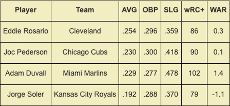While the Braves deserve immense credit for identifying players who could make such a difference for them, this is a tough template to follow. After all, none of the four outfielders they acquired was setting the world on fire when Atlanta picked them up. It’s tough to say the key to a deep playoff runs is to pick up guys with stat lines like these: