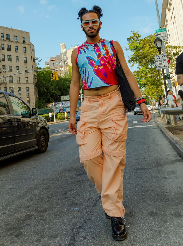 That sense of liberation is on full display in every outfit: leather corsets in neon hues, micro mini skirts, a plethora of cut-outs, crochet tops, bucket hats, platform heels, Y2k-inspired arm cuffs, and Barbiecore fashion. Bikini tops were a top trend, too. Brittany Castellano opted for this formula, sporting a white bikini style with green psychedelic-print pants. “I was just trying to match the theme,” she says. “I’m really inspired by what people are wearing today.” Meanwhile, Leslie Soto sported a bikini top paired with a satin skirt, a look influenced by a search on TikTok which is unsurprising: The hashtag #badbunnyconcertoutfit has gathered nearly 4 million views on the app, with fans sharing their outfit ideas, “get ready with me” videos, and the top trends they saw at the concerts.