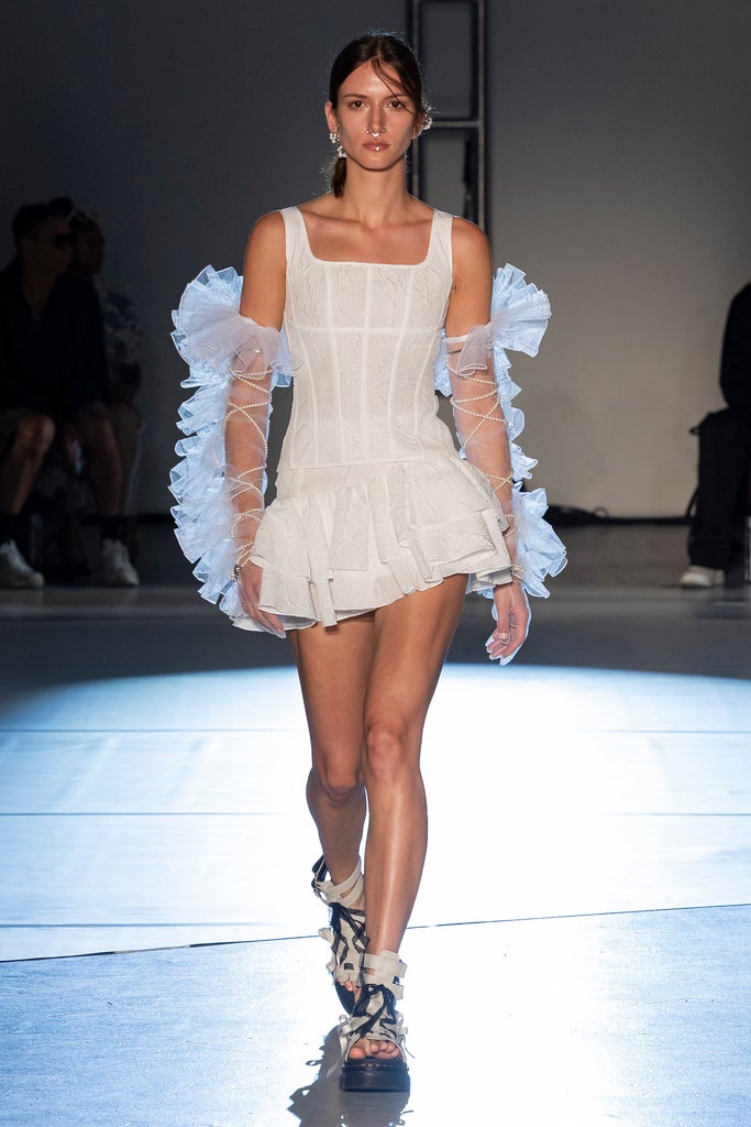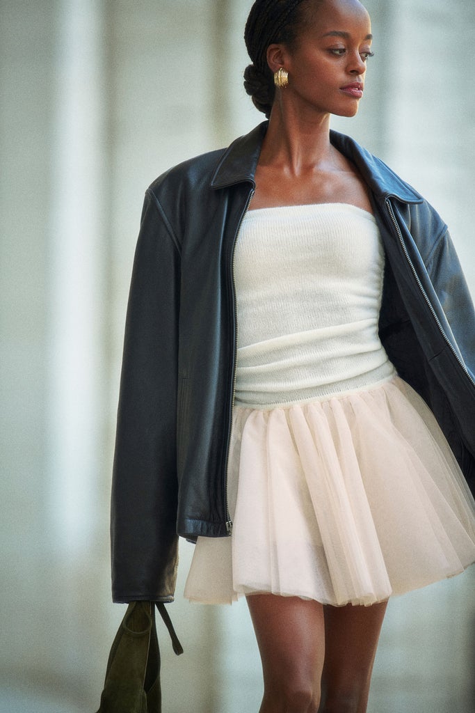 Reznik’s work takes from her own desire for creative and personal expression outside her ballet studio. “The way that I explore dance archetypes in my work is kind of that rebellion that I grew up with,” she says. “I was always longing to go against the grain because there are so many standards that were once in place to be recognized at the company.” In turn, Reznik, who has dressed artists like Doja Cat and Rosalía, shies away from the typical balletcore styles and silhouettes, while still employing some of its defining elements, like tulle and bodycon knits. For resort 2024, she featured a tulle skirt with a studded leather harness, as well as a cut-out leather bodysuit with beaded fringe details. “I always had this fire in me that was like, ‘I want to do the opposite, but still be like within this realm,’” she says.