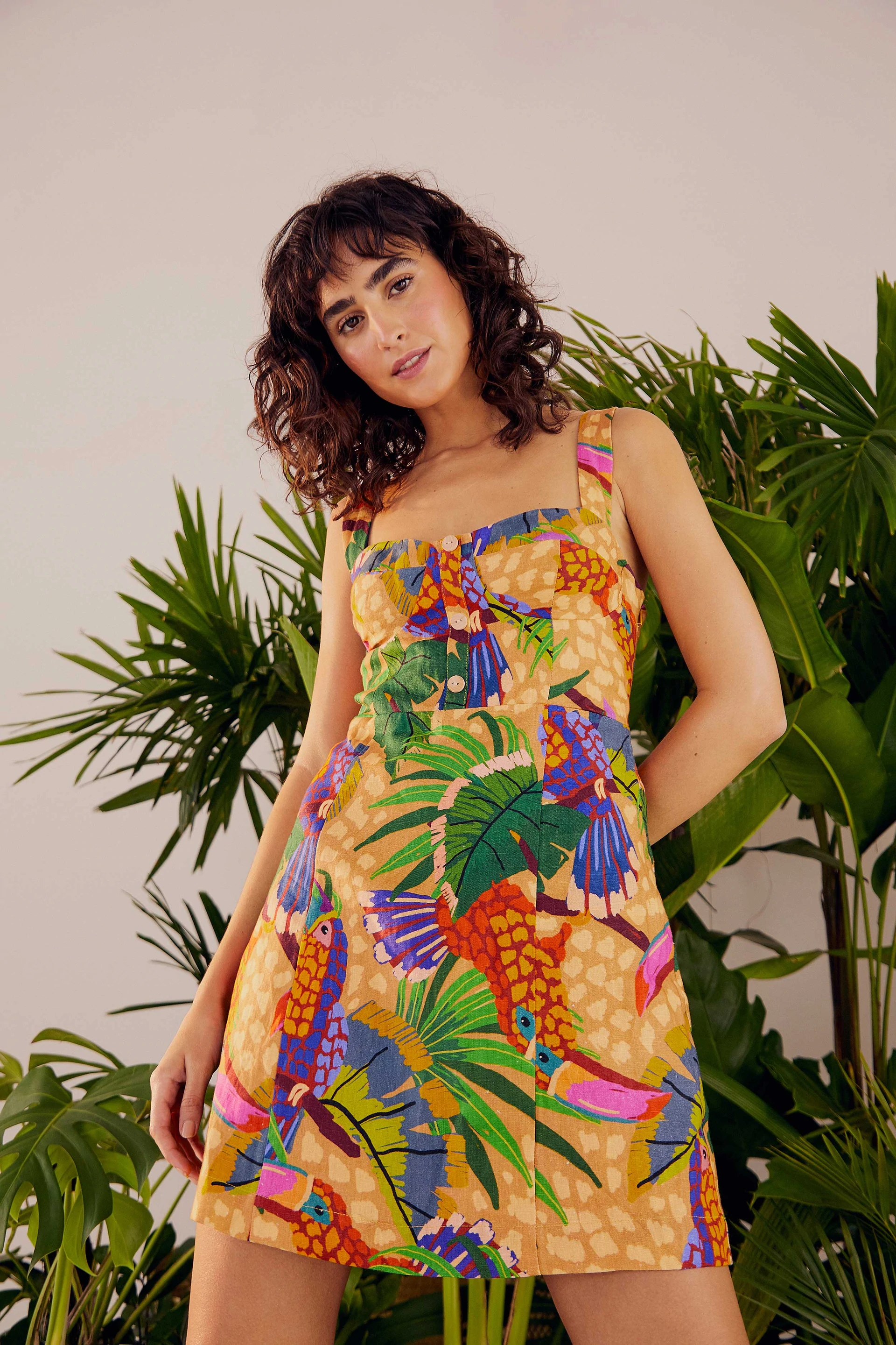 Farm Rio Sand Painted Toucans Mini Dress, $, available at Farm Rio