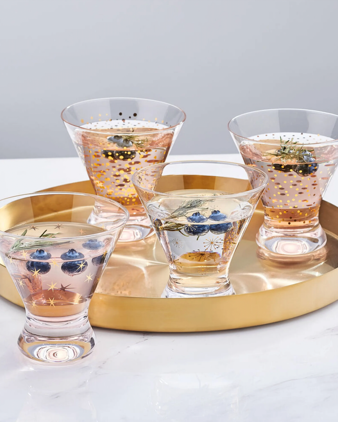 Decorate your giftee’s sparse bar cart with a set of four stemless martini glasses that are sprinkled with festive gold stars and dots. The first toast is on us!