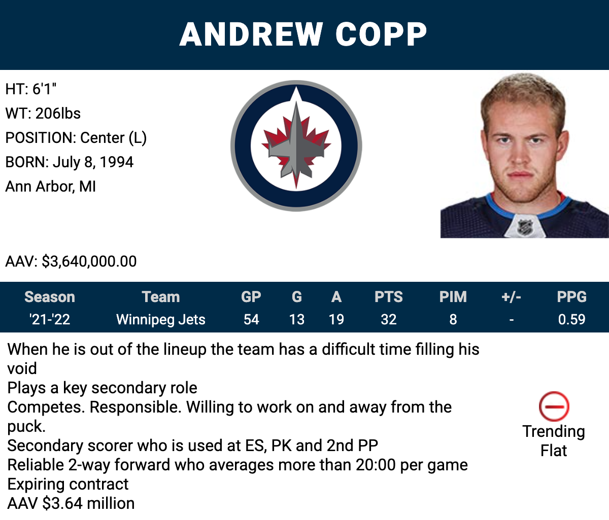 Needs: To not let Paul Stastny and Andrew Copp leave for nothing.