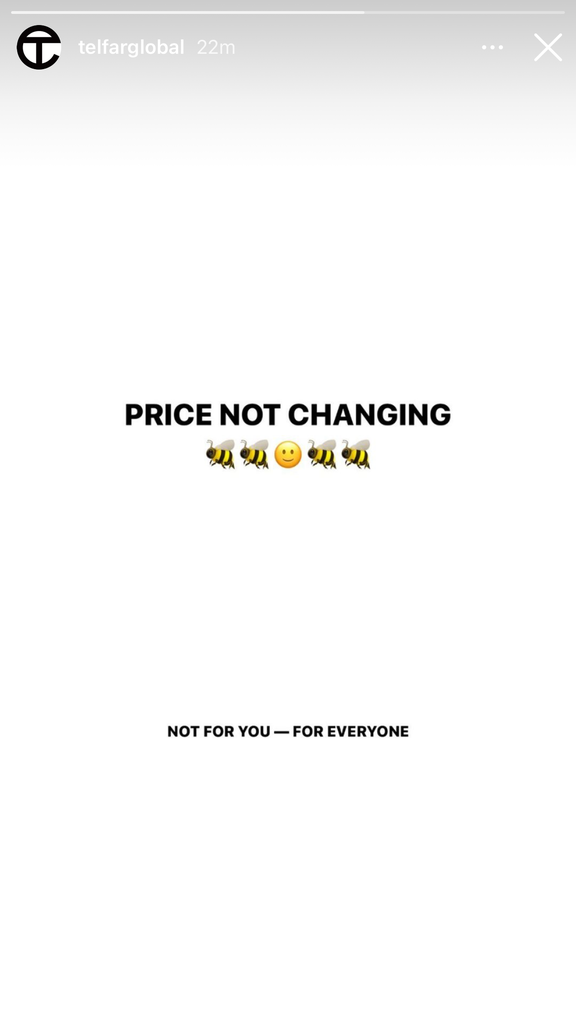 Telfar was quick to quell the rumors floating around on the social media platform, where the brand’s name was trending for the better part of Thursday night. “Price not changing,” read a post on the brand’s Instagram stories, followed by bumblebee emojis, a reference to Beyoncé. “Not for you — for everyone.” And just like that, hope for Telfar shoppers was restored.