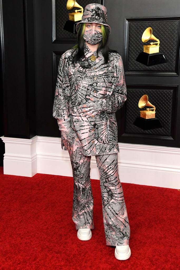 Billie Eilish might be clairvoyant. Last year, before anyone else was masking up, the “bad guy” singer wore a mesh Gucci face mask to the 2020 Grammys. At this year’s event, Eilish looked equal parts trendy and COVID-safe in a matching suit, mask, and bucket hat.