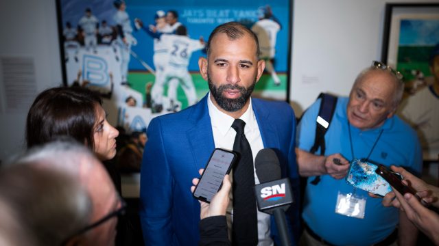 The former Toronto Blue Jays slugger celebrated his 45th birthday by tossing a strike to manager John Schneider in front of a sold-out crowd at the Rogers Centre.