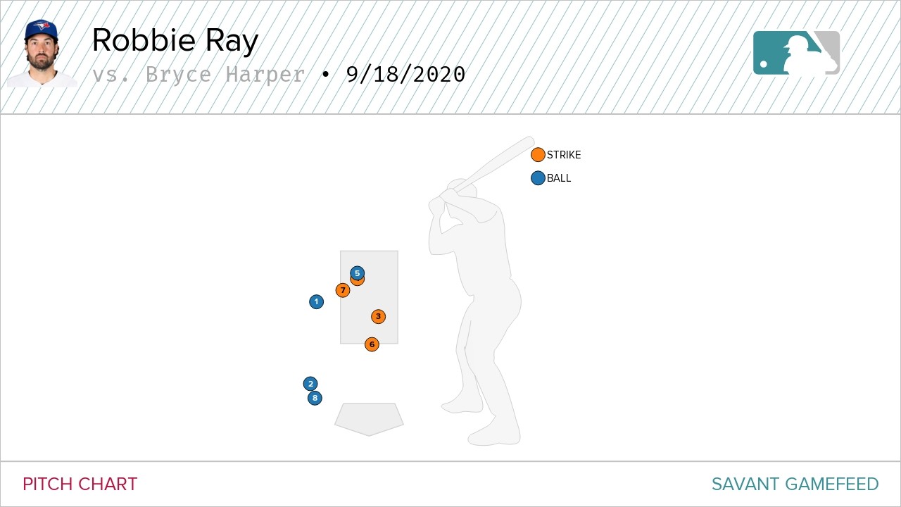 That blue number five there ought to have been strike three for Bryce Harper in his first-inning plate appearance against Ray, the Toronto Blue Jays starter whose 7.7 BB/9 this season certainly hasn’t earned him much benefit of the doubt. But you’d expect that benefit to come into play on borderline pitches. This one was right on the plate.