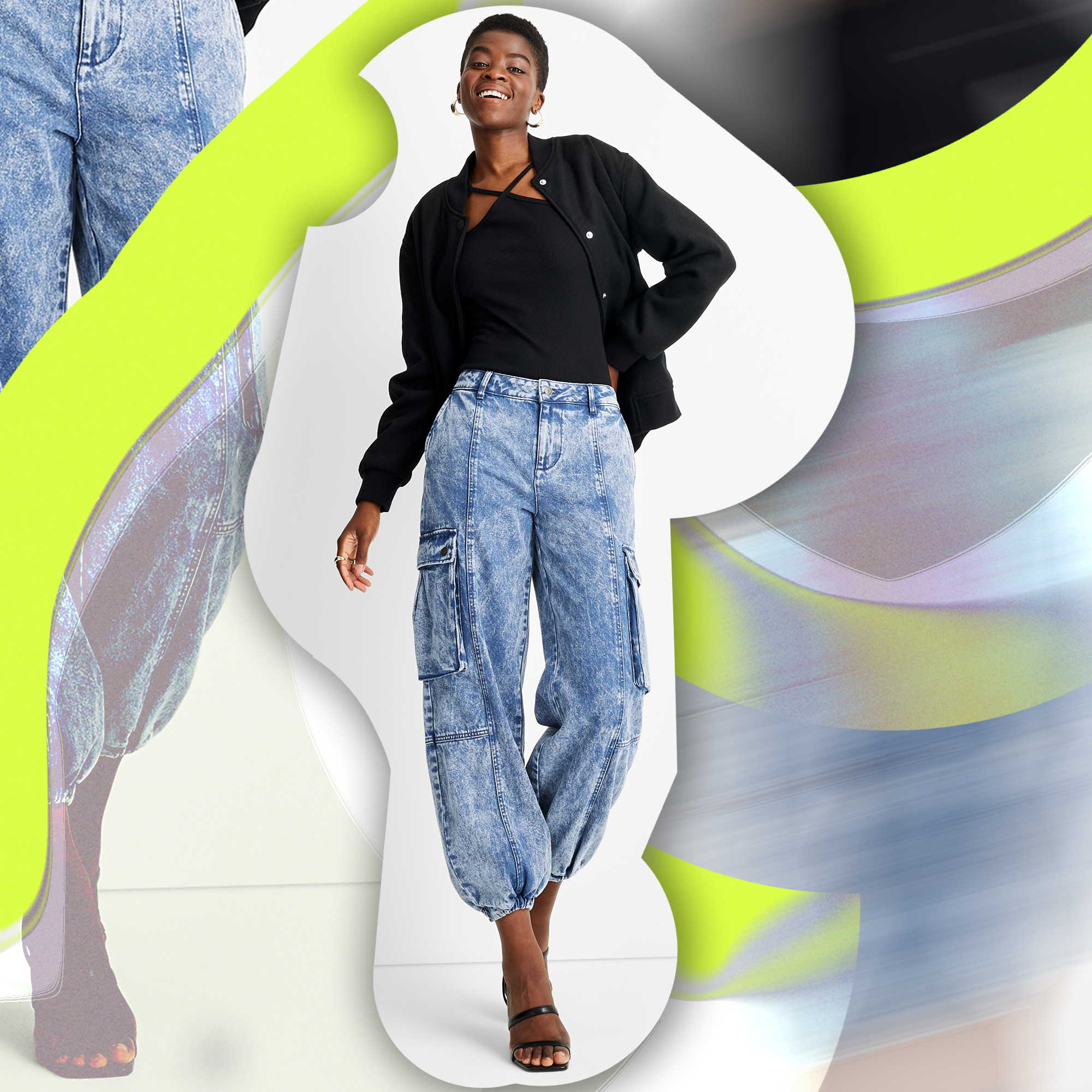 Barfield Brown didn’t want to create your typical wide-leg, light-wash cargo pants, so she went for an acid-wash version with cinched bottoms — a bolder iteration that she says works well for the XXS to 4X sizes that the collection accommodates. “A cinched bottom is a flattering silhouette on most body types,” she says. “And if you’re shorter, a tapered pant leg is a great option, as wide-leg styles can be too long and drown you.”