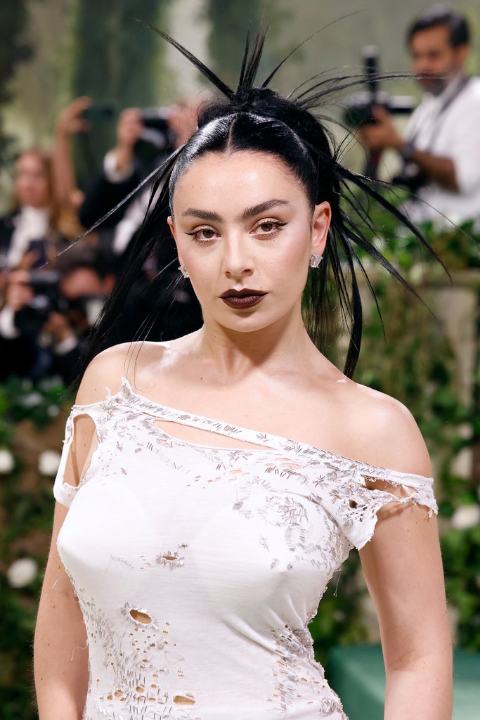 When asked what Charli’s Brat essentials are in a BBC Sounds interview, the singer suggested the aesthetic teeters between “quite luxury and so trashy” and that she’d wear “a strappy white top with no bra.” This is exactly what she wore in the viral 360 music video, a look that she styled with black briefs and sheer black tights, but even before that, she wore a tattered T-shirt-inspired gown to the 2024 Met Gala (above). For everyday life, opt for a classic white tank top to wear on its own throughout the hot summer or to serve as a staple layering piece. And if you’re looking for something more playful and kitschy, take inspiration from Charli, who sings about baby tees in 360, and her fans, who have been wearing Brat-inspired graphic T-shirts.