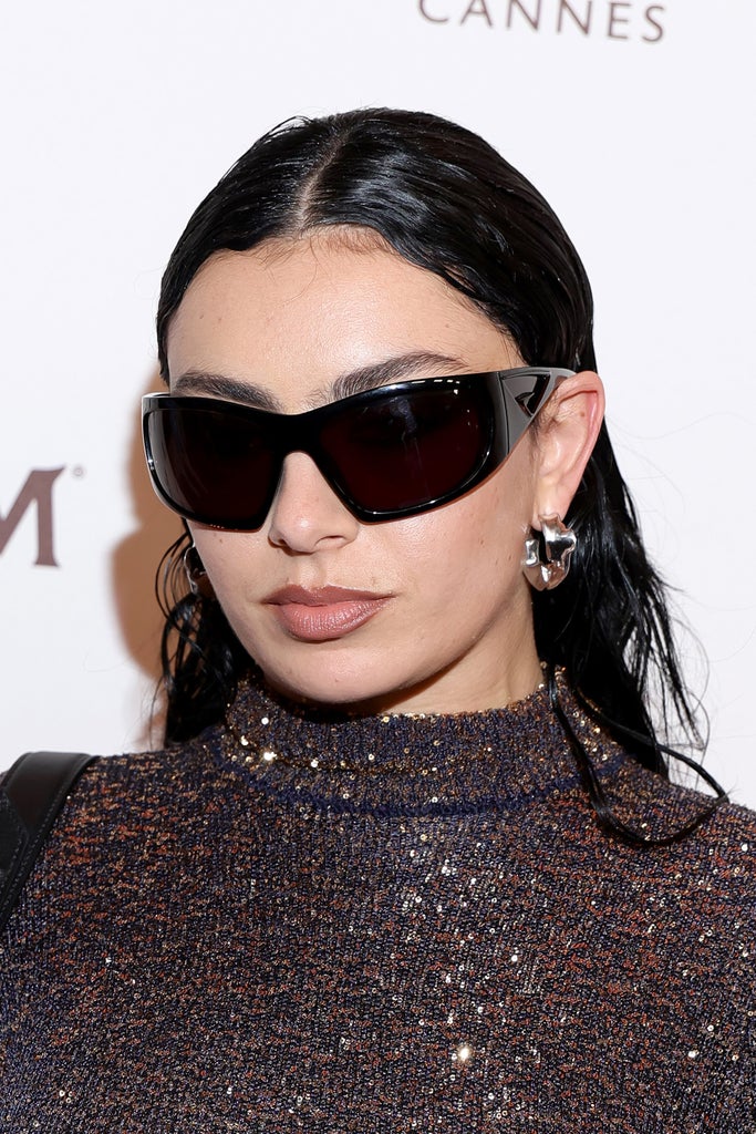 Embrace the Y2K aesthetic with wrap-around sunglasses. Pick from a style that gives a luxe, futuristic Matrix vibe… or a gas station-chic athleisure look. Charli has been seen wearing the retro sunglass style in black with crop top-and-jean combos, patterned mini dresses, and even evening gowns. You, too, can cart up sleek black wrap-around sunglasses that can go from day to night (we recommend wearing them indoors and out clubbing, while scream-singing “Club classics” like Charli). Opt for clear, mirrored sports sunglasses for casual summer outfits or pink shield sunglasses for a pop star-approved look.