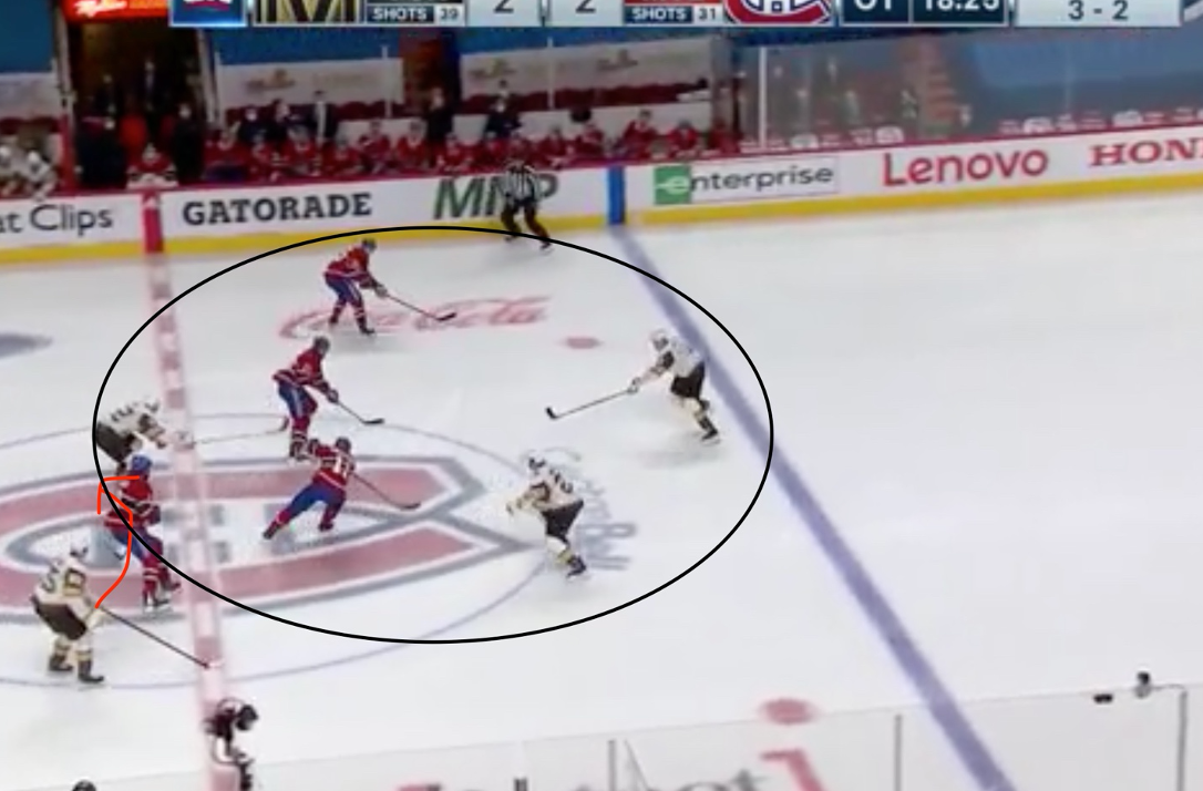 Based on Nosek reaching for the puck and heading downhill to the net, and Danault having a little lateral momentum going, the Habs forward is able to cut up ahead of Nosek, and turn a 2-on-2 in a 3-on-2.