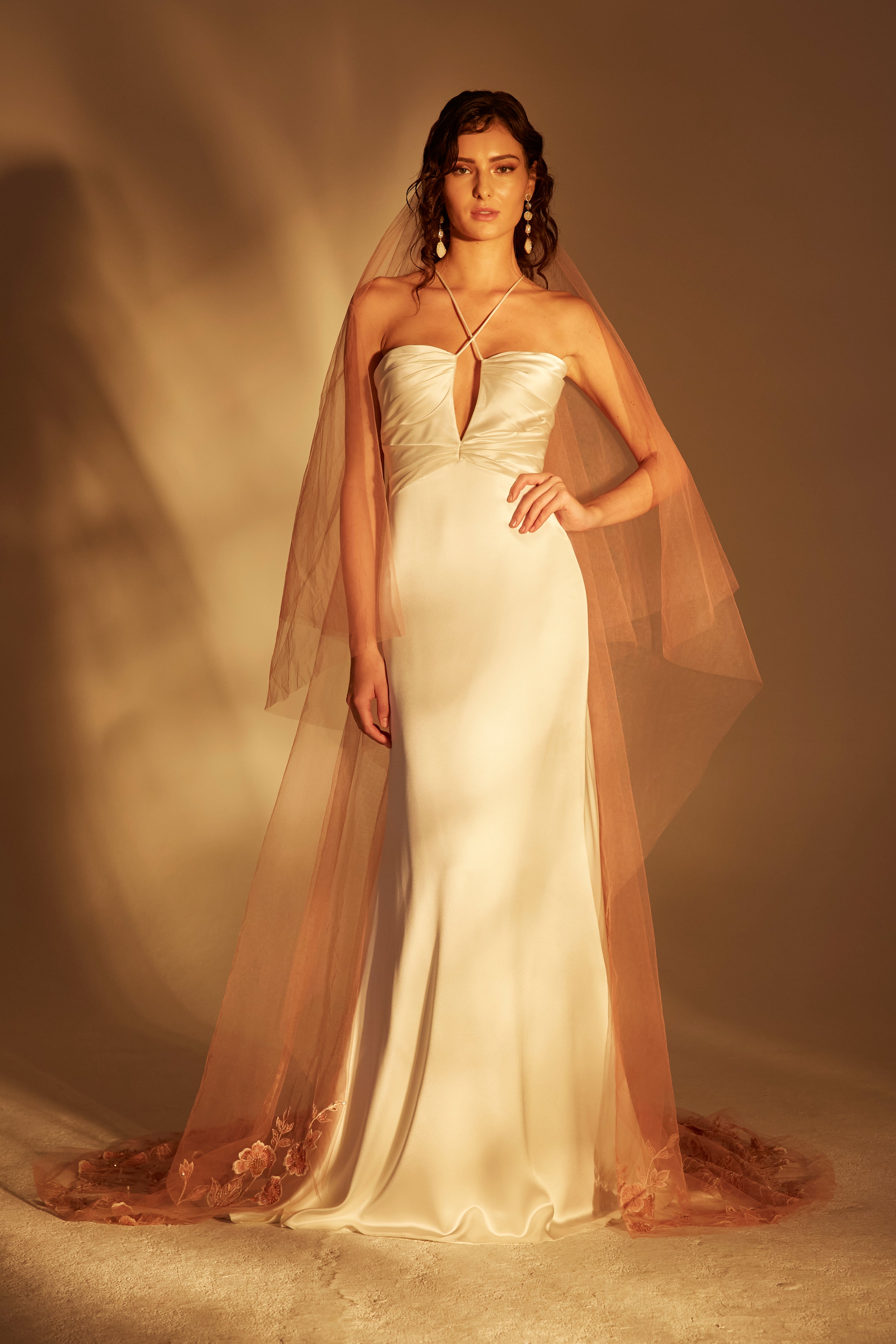 If there’s a bridal accessory that’s remained untouched over decades, it’s the veil. But bridal designers are seeing this traditional accessory — rooted in ancient Rome — become more of an add-on than a part of the look. This is why veils are becoming shorter, with designers like Wiederhoeft, Cinq, and Honor featuring versions that only reach the bride’s neck or waist, resulting in an avant garde look. For a dramatic approach, designers are also going for custom embroidery — see: Hailey Bieber’s Off White wedding gown — and making colorful veils.