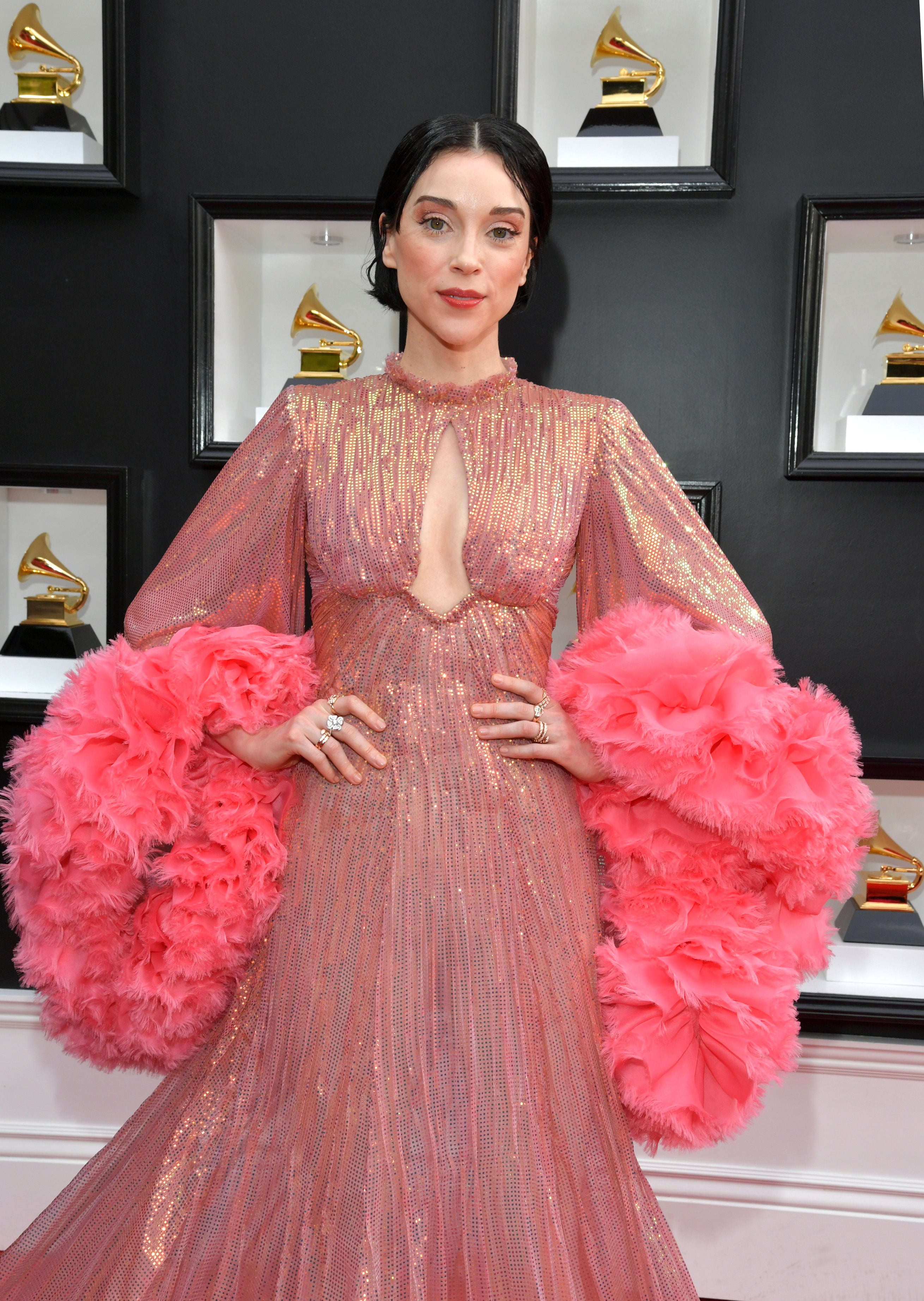 While Hollywood takes a genteel approach to a dress code, the Grammys’ red carpet demands risk — and the guests did not disappoint. Kicking us off, we have Billie Eilish in an architectural Rich Owens number, a slew of stars going bold in Versace, and Megan Thee Stallion in a glorious cheetah print Roberto Cavalli gown with a thigh-high split — a thoughtful ode to the fashion of Grammys’ past.