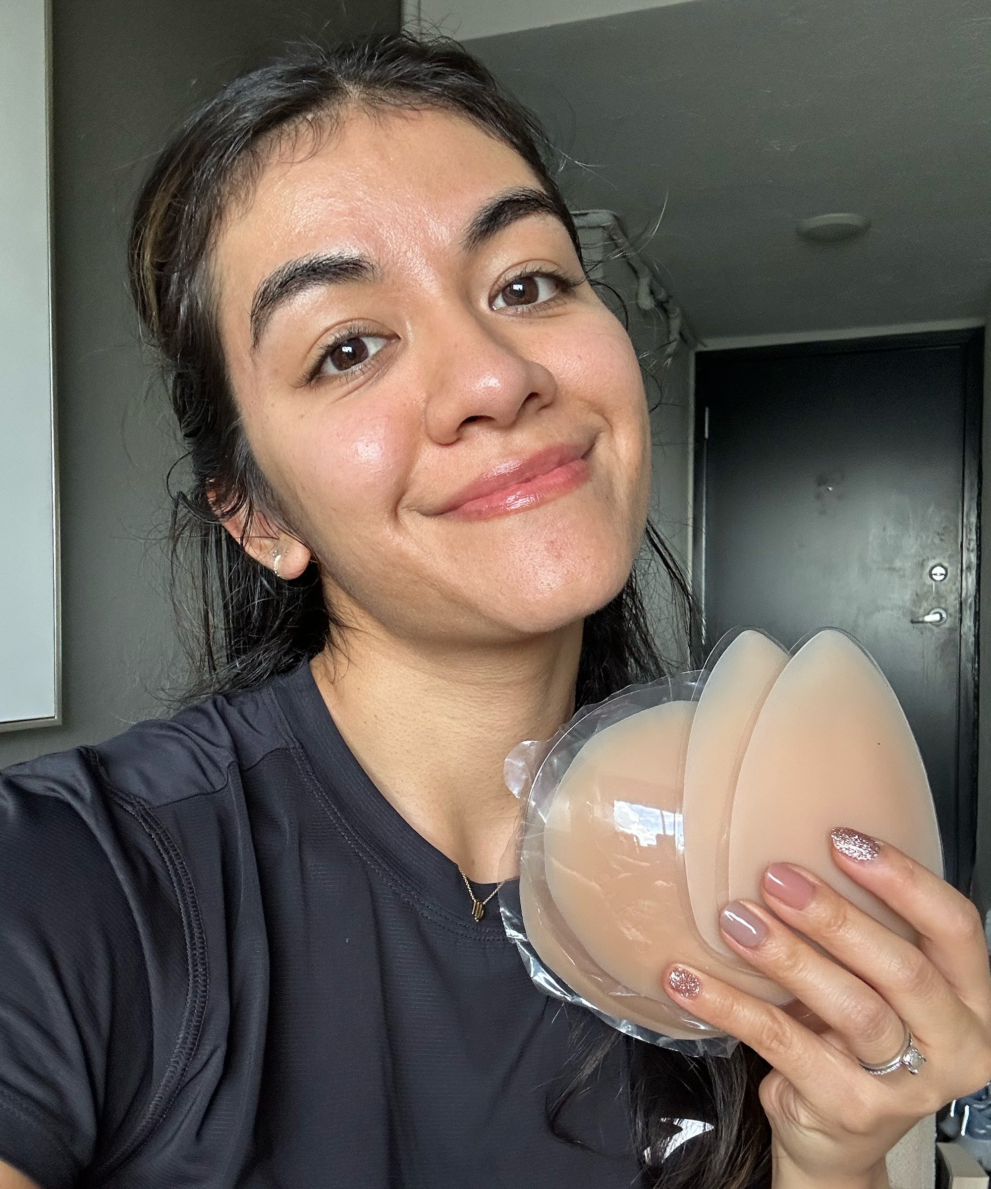 Later that week, I gave the Grippy Triangles, which have an elongated, pointed shape that offers coverage for trickier styles, a try; since they have a sleeker profile, they work for low-cut or V-neck styles that the Circles may have peeked out from. What’s more, Cakes says you can wear these with swimwear (and for working out, but I tend to need more significant support if I’m doing anything more intense than walking). To test this theory, I threw on a triangle bikini and hopped in the pool. I was honestly impressed that the covers stayed in place through swimming and then laying out in the sun; water and sweat didn’t affect the grippiness of the silicone whatsoever.