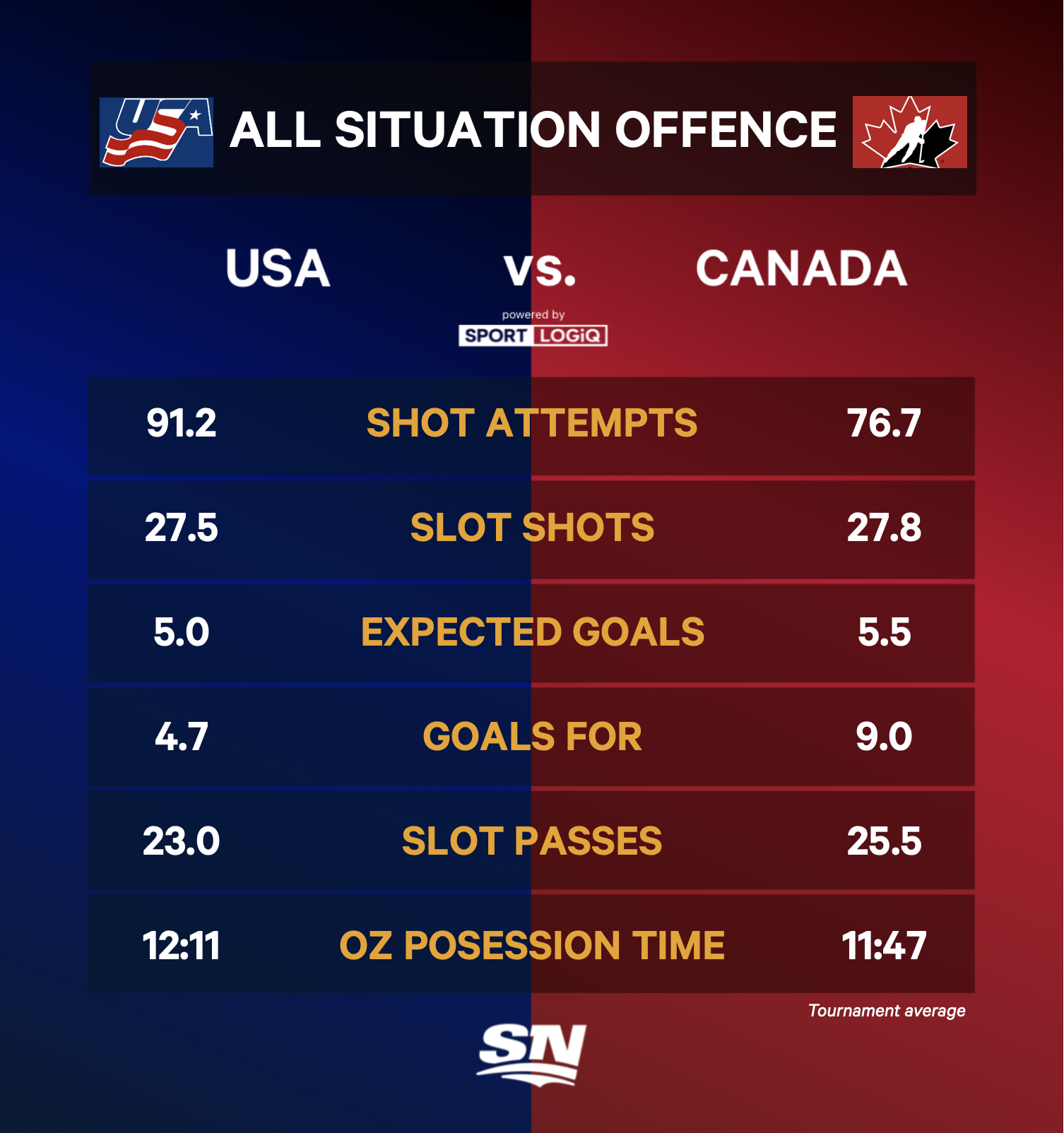 They lead all teams in shot volume, with 91.2 attempts on average, and 49.5 shots on goal. Where they rank below their opponent to the north, and second overall in the Games, is quality with 27.5 slot shots and a total expected goal value of 4.95.