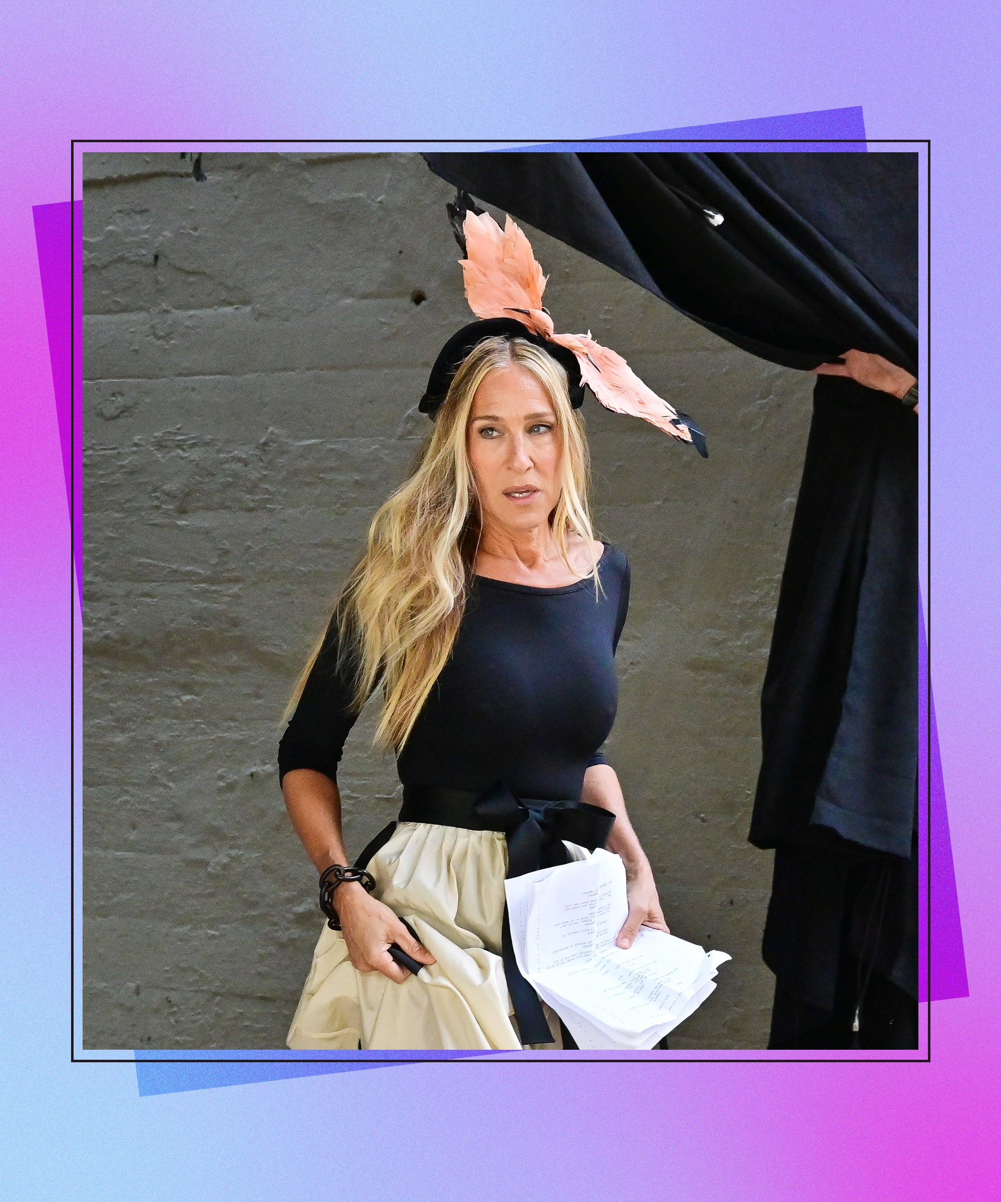 Over the past three decades, Sex And The City’s Carrie Bradshaw (Sarah Jessica Parker) has worn unforgettable outfits that we keep coming back to. But the time she donned a feather fascinator to her first wedding attempt to Mr. Big (Chris Noth) still haunts fans to this day. It didn’t stop costume designers Molly Rogers and Danny Santiago from bringing a version of the look back for the SATC reboot …And Just Like That. On Monday, Parker was spotted wearing a bird-like black-and-pink headband while shooting the series.