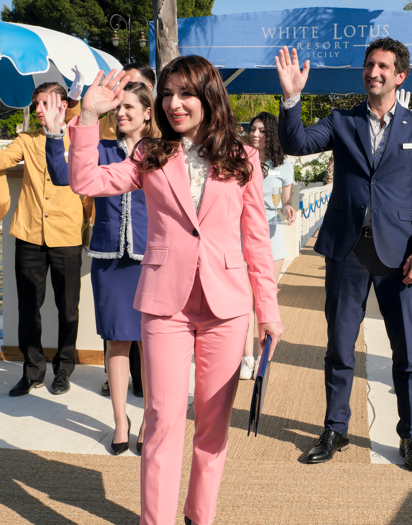Valentina is The White Lotus’ hotel manager and always does her job in impeccable style. She usually wears bright monochromatic suits with a fun printed shirt underneath, always with a pair of pristine pointed heels. To mimic her professional style with a more vacation-appropriate feel, try swapping trousers for tailored shorts or go for two-piece sets. And if you want to feel like a boss, we’ve got you covered with a mini briefcase purse.