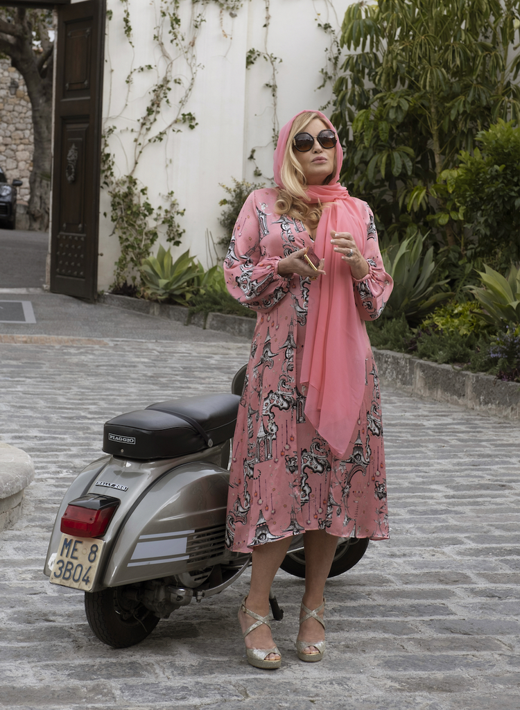 Lucia is bold, fiery, and seductive, which is perfectly reflected in her clothing and accessory choices. The Sicilian local tends to wear low necklines and short hemlines. And after gaining an impressive sum of money from a father-son duo staying at the hotel — and unlimited access to their credit card — Lucia shops until she drops. Throw on some cat-eye sunglasses and a gold charm necklace to elegantly bask like she does.