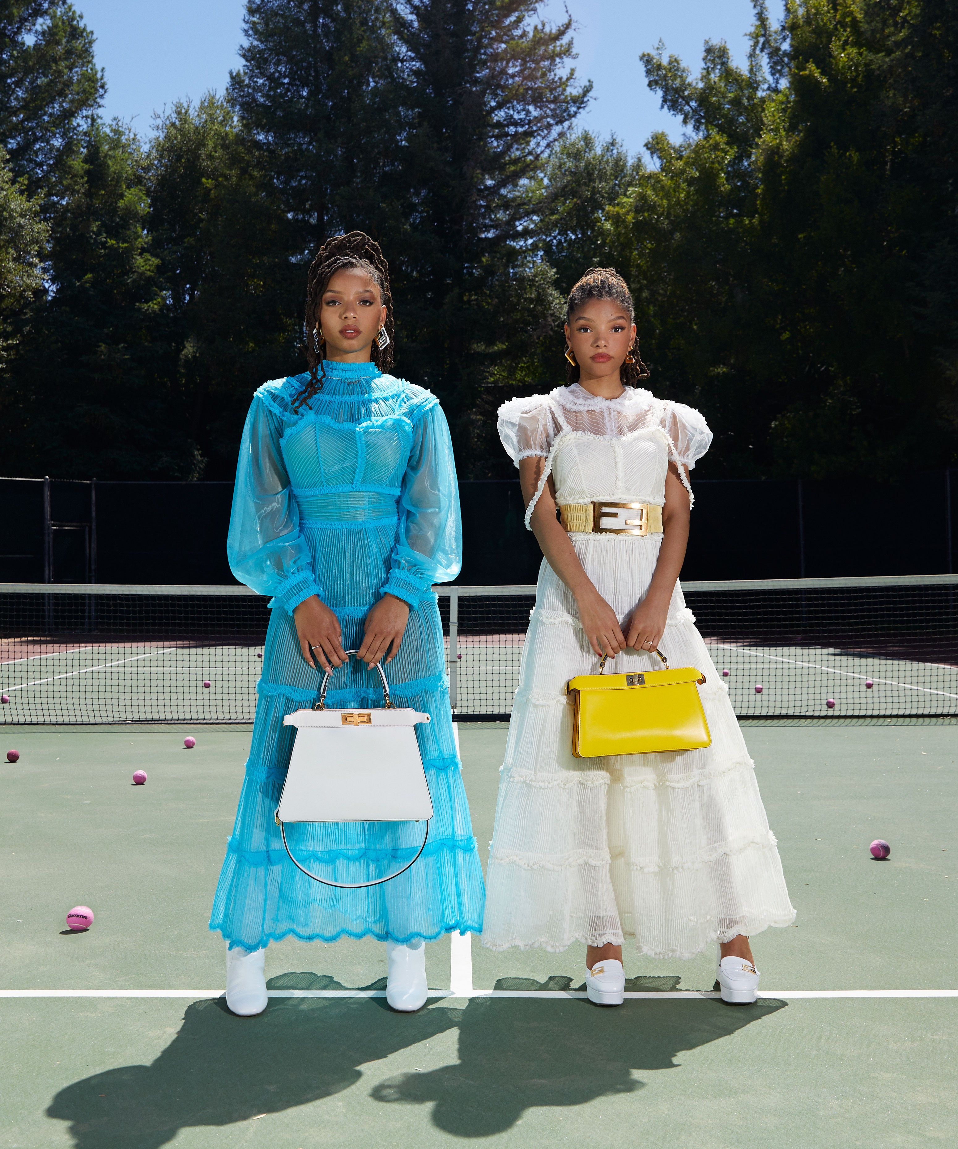 Naturally, “Busy Boy” off of Ungodly Hour is the theme song for the video, which was art directed by Andrew Makadsi, shot by Derek Milton, and styled by the duo’s longtime stylist Zerina Akers (who is also responsible for some of Beyoncé’s most notable looks). The photos for the campaign are equally impressive, thanks to photographer Julian Dakdouk. In them, Chloe x Halle don complementary houndstooth blazers at their kitchen table; back on the courts, the sisters pair their yellow and white Peekaboo bags with white and electric blue sheer gowns, respectively.