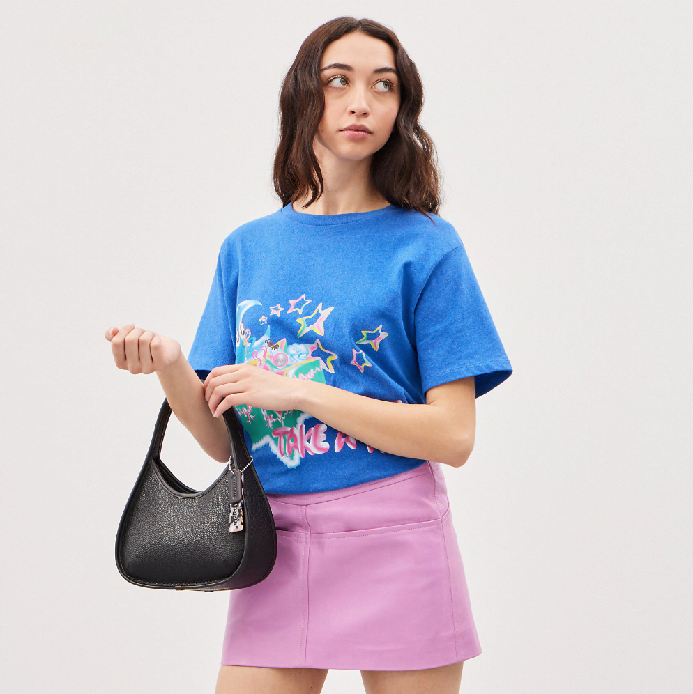 With the new offering, which includes accessories, handbags, and ready-to-wear, the brand’s signature pieces — a staple of ’90s and Y2K fashion trends— are getting a refresh. Shoulder and belt bags, for example, are transformed from monogram prints and neutral shades to bright blue, yellow, and green colorways, as well as mushroom and checkered prints with interchangeable chain and leather straps. The nostalgia continues with some of today’s TikTok-approved trends, from patchwork denim mini skirts and bucket bags to quirky hair clips and psychedelic graphic tees.