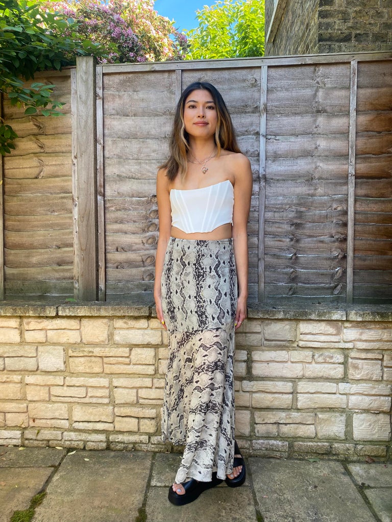 How I styled it: As it’s super cropped and navel-grazing, I’ve paired it with a high-waisted maxi skirt for a more balanced proportion. I’ve gone with a muted earthy palette with snake print which contrasts against the white of the corset. Then I’ve opted for all-black accessories, with chunky platform sandals to add a chic summer touch.