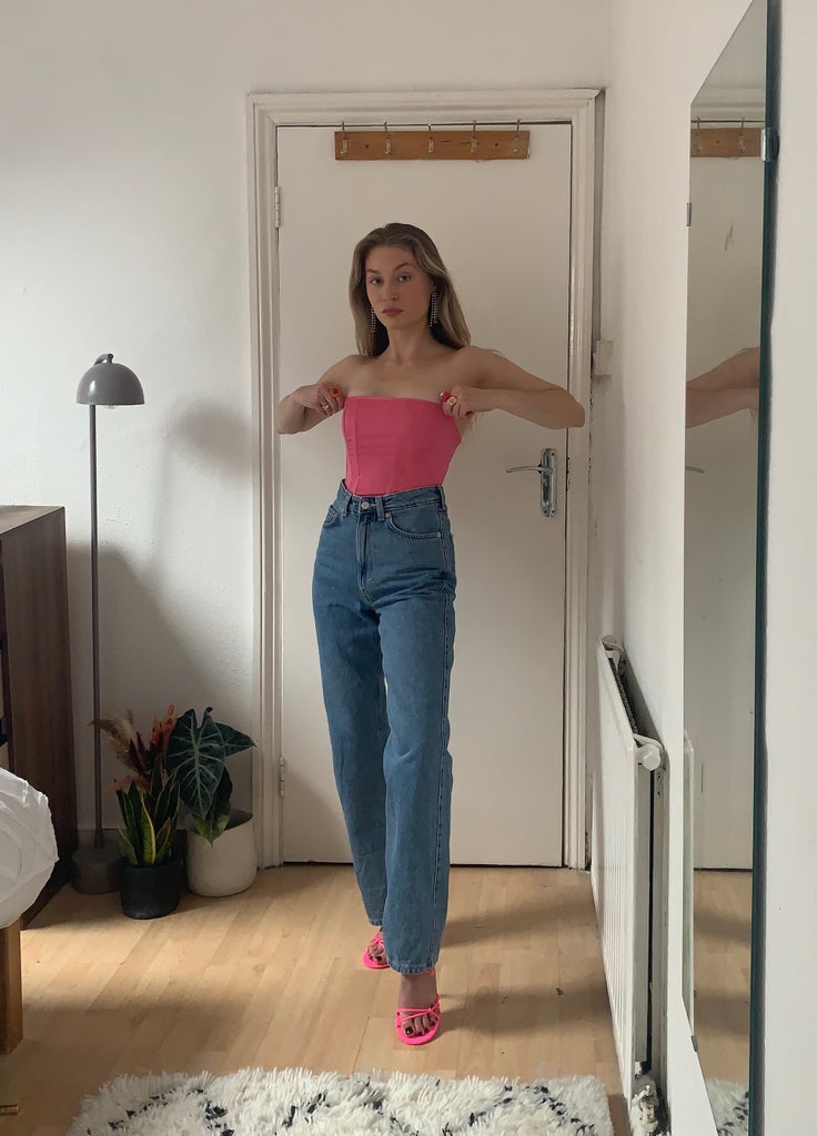 How I styled it: While I could have gone for a ’00s backing dancer vibe with cargo pants, I decided this corset was the perfect “jeans and a nice top” situation instead. To complete my look, I added a pair of neon heels and diamanté earrings to really amplify the glam.