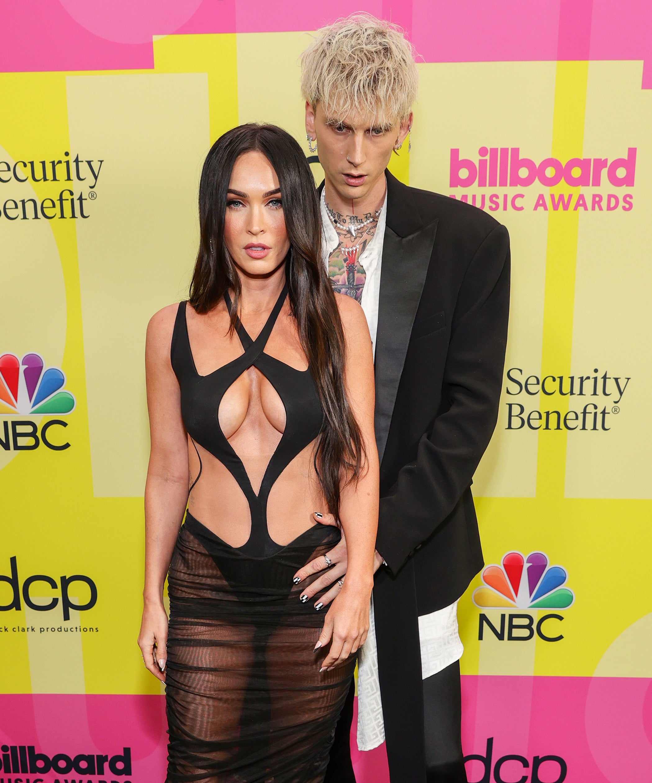 While accompanying twin flame Machine Gun Kelly — who went on to win a BBMA for Top Rock Artist — Megan Fox wore a barely-there black dress from Mugler’s spring ‘21 ready-to-wear collection. The form-fitting silhouette featured a series of curvy cut-outs on the front and back, as well as a sheer, midi-length skirt. Stylist Maeve Reilly added Jimmy Choo platform heels and Shay Jewelry to complete the can’t-miss look.