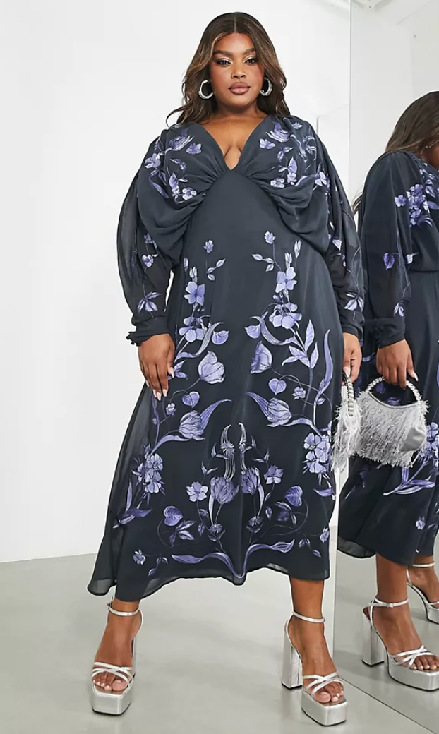 ASOS Batwing Chiffon Midi Dress With Floral Embroidery, $, available at ASOS Edition Curve