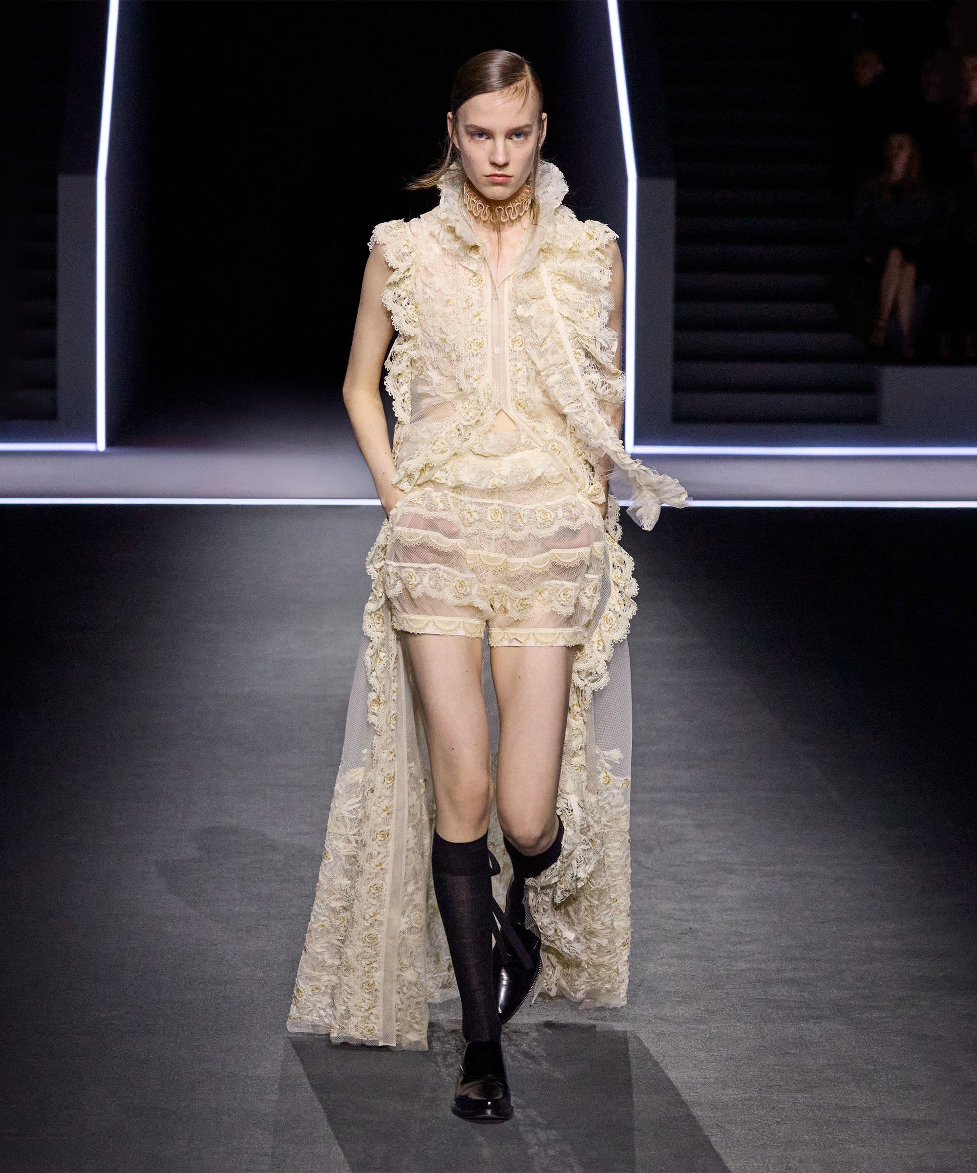 As expected from the literary source of inspiration, the collection explored the balance between the masculine and feminine with delicate ruffles and bustiers punctuating severe waistcoats, frilly collars peeking out from underneath leather jackets, and lace-up riding boots styled with lace bloomers.