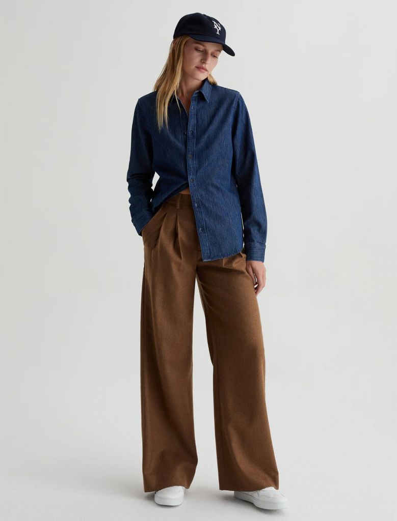 New Yorkers always have a laid-back flair, and EmRata has curated a ‘fit that suits the vibe. A fitted denim button-up, wide-leg pants, and a classic wool baseball cap embroidered with “NY” — what more can you ask for? How about the celeb’s signed initials on the back of the cap? Consider it done.
