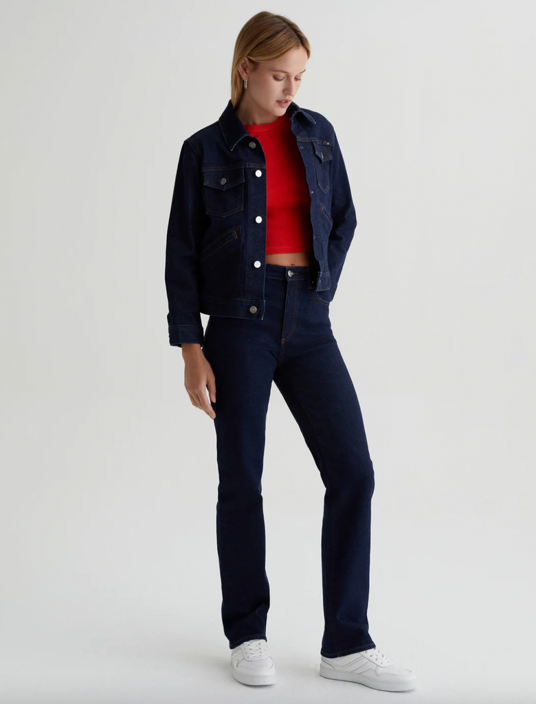 If you’ve been afraid to venture north into Canadian Tuxedo territory, here is your chance. EmRata has created an easy ensemble with her fitted jean jacket and Alexxis high-waisted straight-leg jeans. Unlike a light wash that leans casual, the dark denim adds a bit of polish to the everyday look. Brighten it up with her red baby tee for a refreshing pop of color.