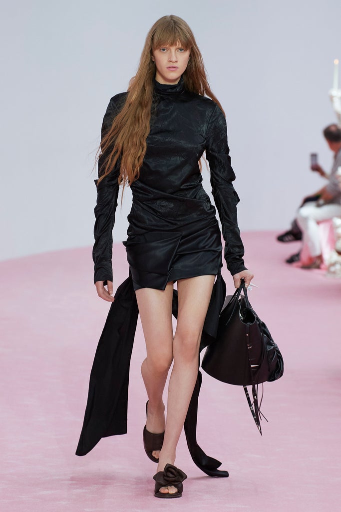 Take, for example, the dresses and skirts seen at the spring/summer 2023 shows, where designers displayed everything from high-low hemlines, as well as asymmetric skirts that looked as if shredded with the wind, and full-on trains. At Blumarine, where Y2K pop punk styles made their way down the runway, designer Nicola Brognano showed jersey dresses in pink and ash shades with floor-length strips of fabric. Then, there was Acne, which featured similarly asymmetric trains in silky dresses that mimicked traditional red carpet numbers. Meanwhile, Bally featured a plunging neckline mini dress with a lopsided, floor-sweeping hemline.