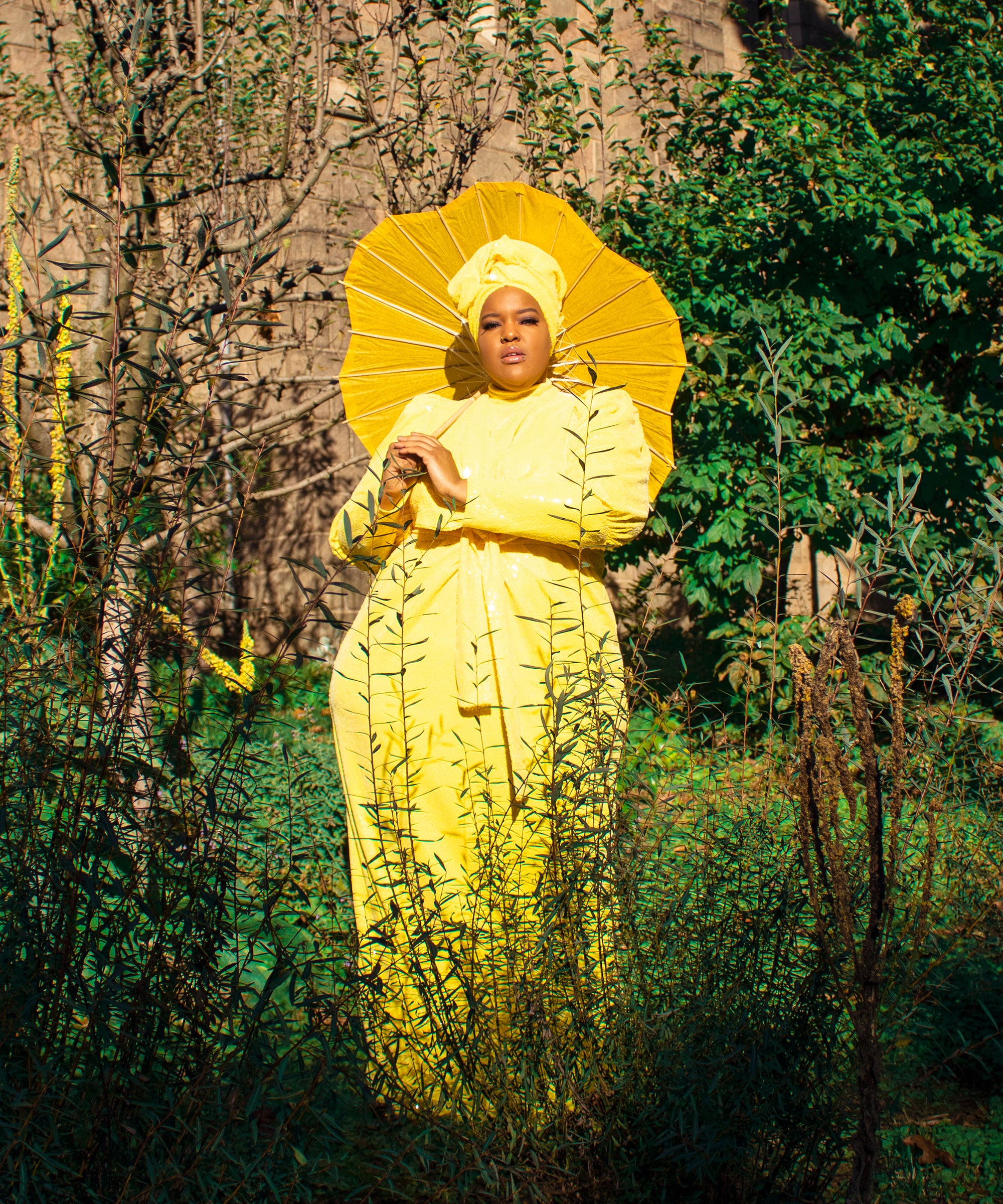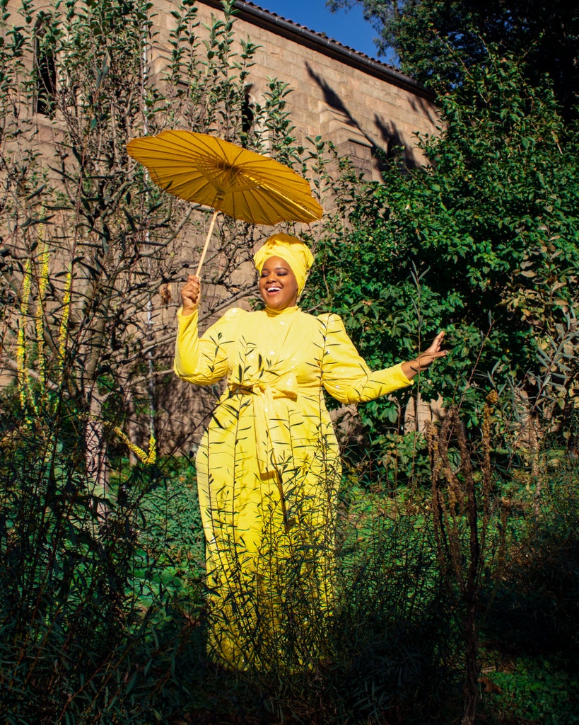 For the brand’s “Six Icons, Six Days” collection, Vernon, who is known for her colorful looks, designed a long-sleeved, sequin yellow gown. The dress, which she told Refinery29 is “the perfect combination of color, drama, and poise,” features a large, bow-like detail in the center, a mock neck, and exaggerated shoulders. In the campaign, Vernon wears the look with a matching yellow turban — that’s also part of the drop — and carries a golden umbrella. (Since the dress’ shade of yellow was so obviously reminiscent of the sun.) “I love all things glam — all things loud and bold and queen-like,” Vernon says of the inspiration behind her custom look. “The theatrics and the sequins are what I want to be in, even if I am just casually going to the dollar store. We should feel and look good, no matter what the activity. Tongue pop.”
