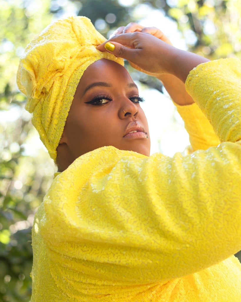 While a yellow, sequin gown may seem hardly functional in a pandemic, according to Vernon, it’s exactly why she designed it. “In the beginning of the lockdown, I’m not going to lie, I was in sweats and raggedy hoodies,” she says. “But, I knew that I needed to stay on track and that in order to keep a sense of normalcy that I’d have to continue doing what I always do.” Now, she tends to straddle the line between function and “something that makes [her]feel like a superstar diva.” She hopes this look will inspire people to get dressed up in something daring and bright as a way to uplift their spirits. “Take fashion risks,” she adds. “Just do it.”