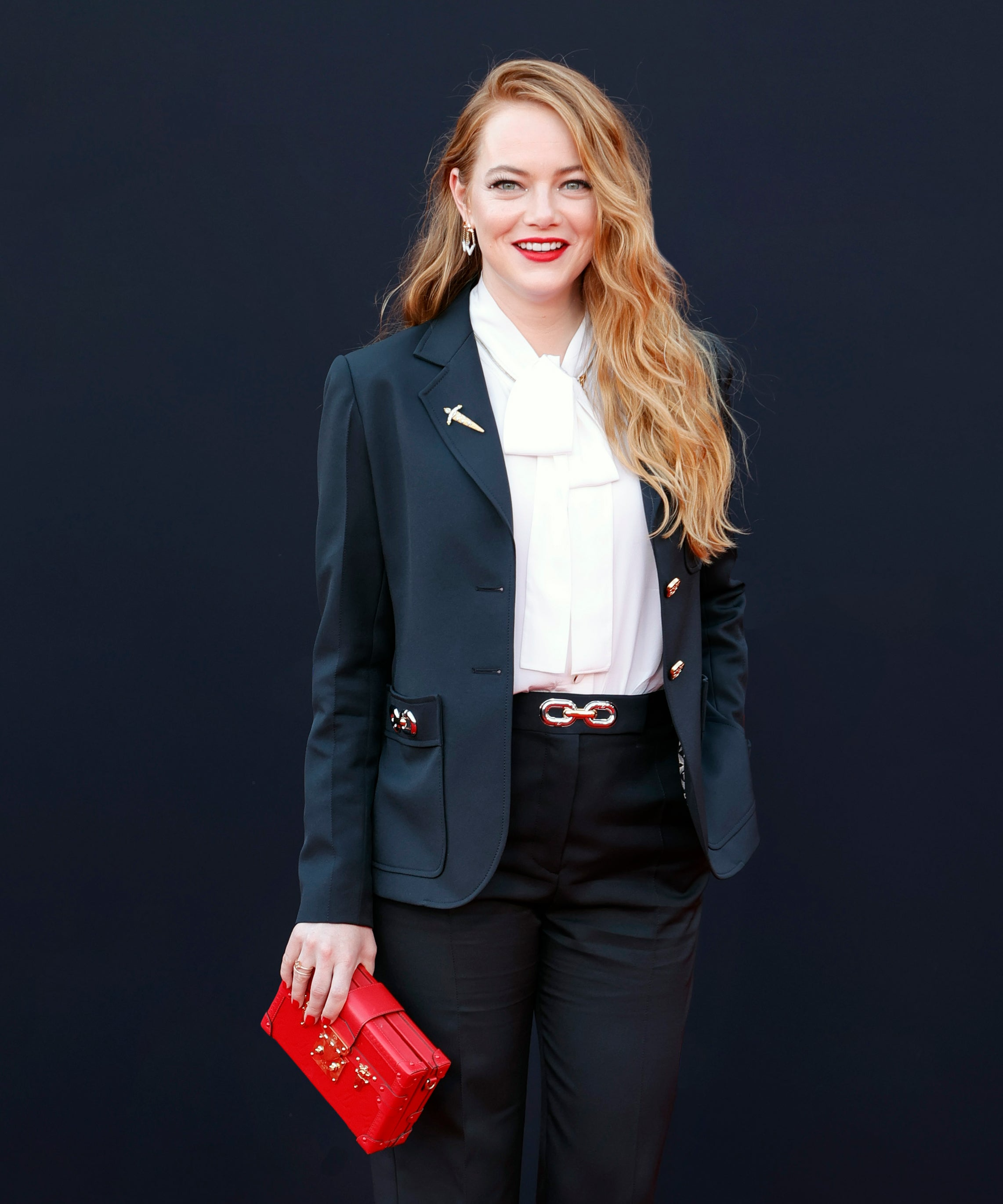 For her big night, Stone, who plays 101 Dalmatians’ Cruella de Vil, took a note from her on-screen persona’s style playbook, dressing in her signature color palette of red, black, and white. With the help of longtime stylist Petra Flannery, Stone selected a tailored suit featuring gold-and-silver hardware, a white pussy-bow blouse, and a red Petite Malle clutch from Louis Vuitton.