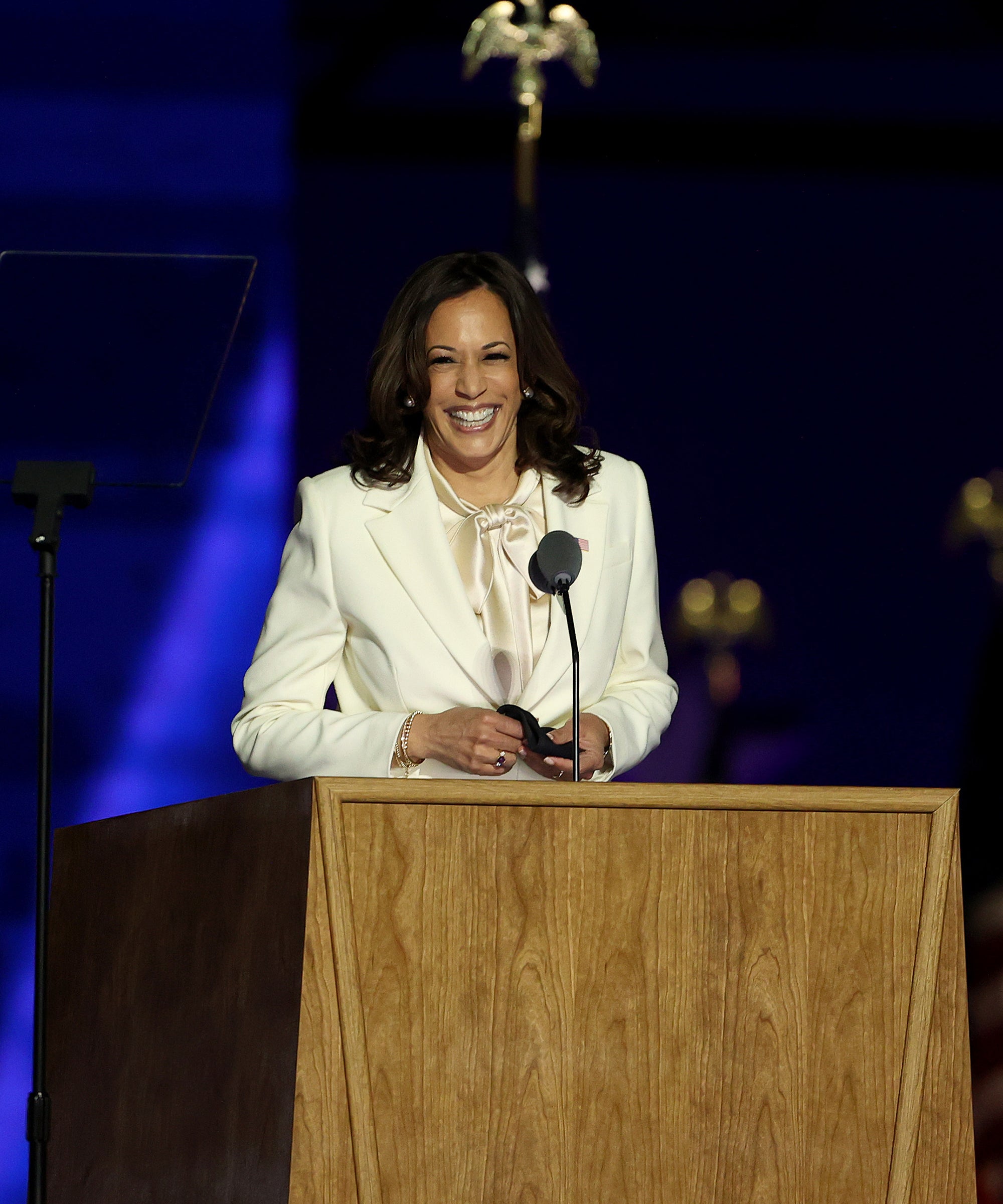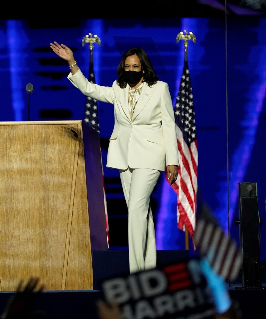 On Saturday night, after making history as the first woman, first Black person, and first South Asian American to be elected vice president of the United States, Kamala Harris took the stage (to the beat of Mary Blige’s “Work That”) at the Chase Center in Wilmington, DE, to give her acceptance speech. For the occasion, Harris wore head-to-toe white: a pussy-bow blouse underneath a suit by New York-based label Carolina Herrera. A pair of pearl earrings, a longtime accessory of choice for Harris, completed the look. In her speech, Harris praised the President-elect Joe Biden for his “audacity” in choosing her as his running mate. “But while I may be the first woman in this office, I will not be the last,” she said.
